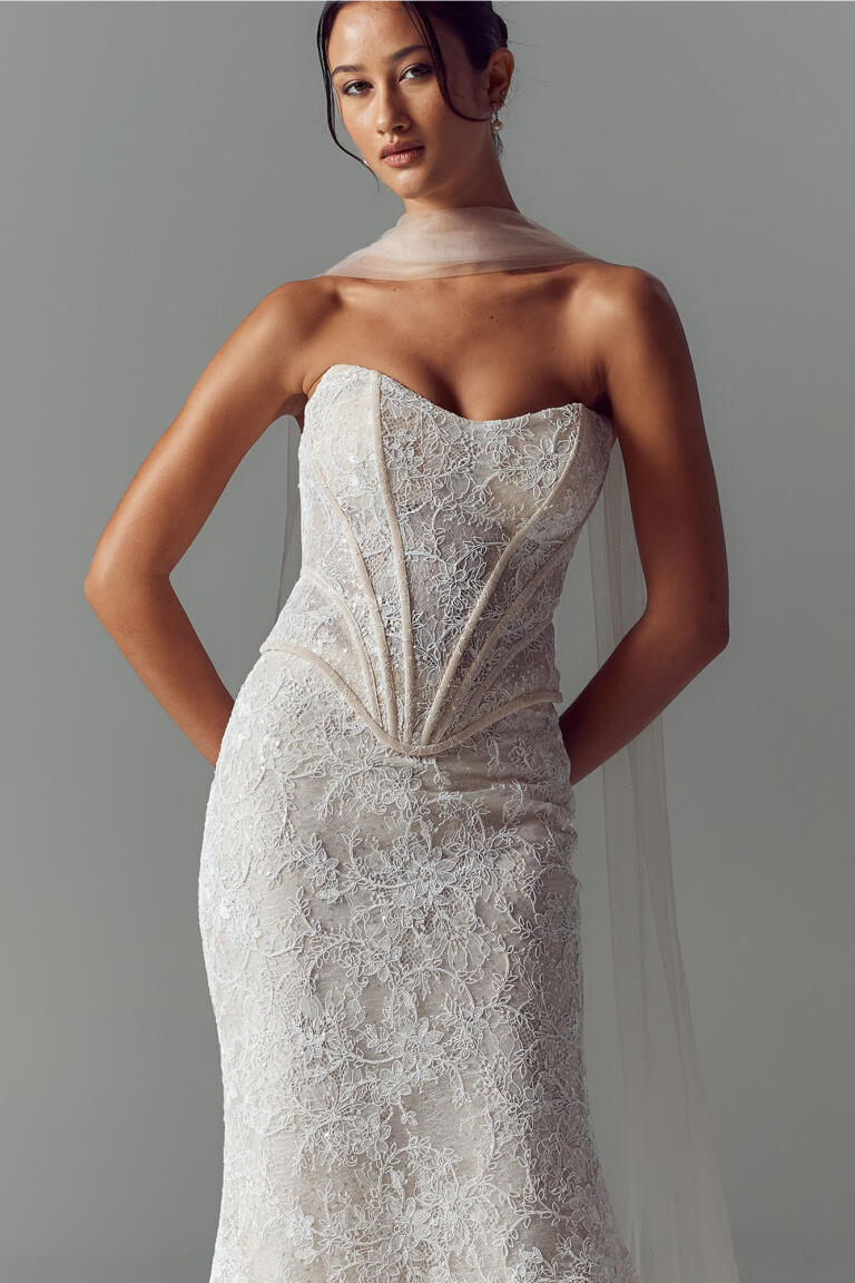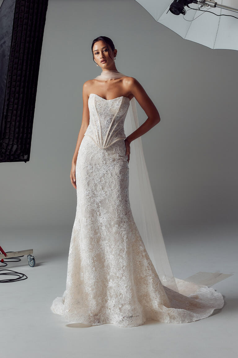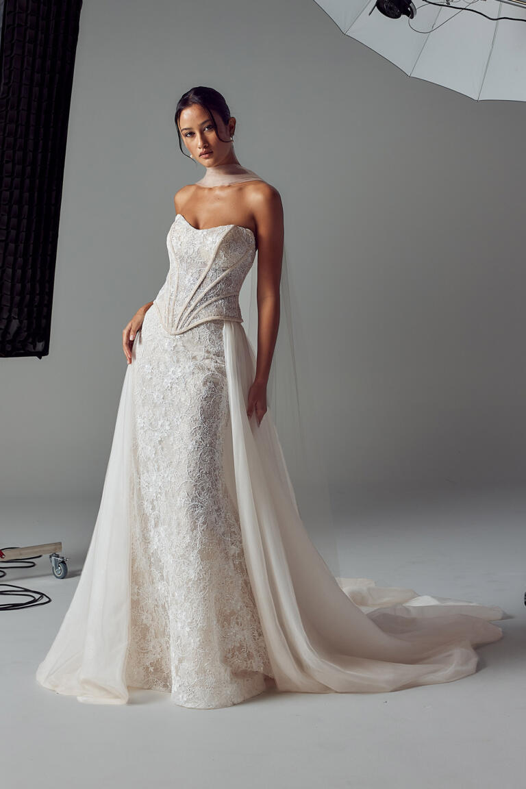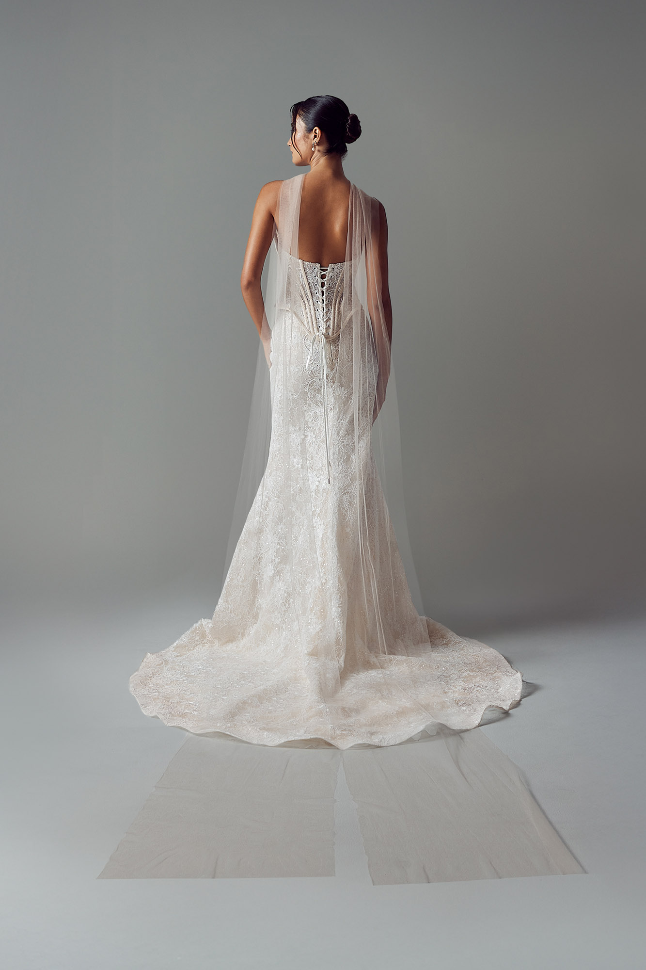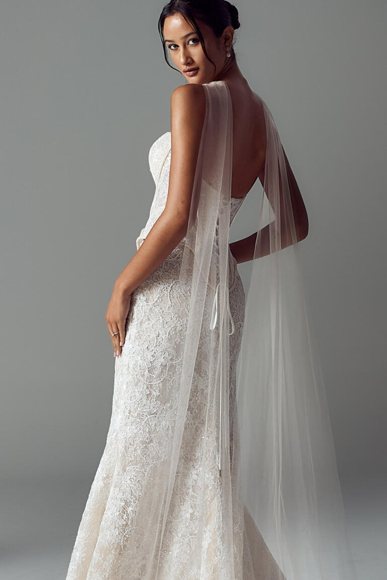 In Ivory or Blush toned tulle, with dramatic tales that extend past the train for added statement.
