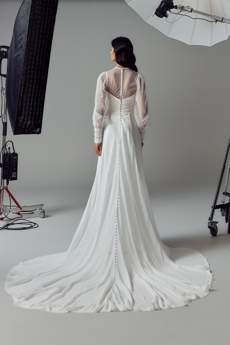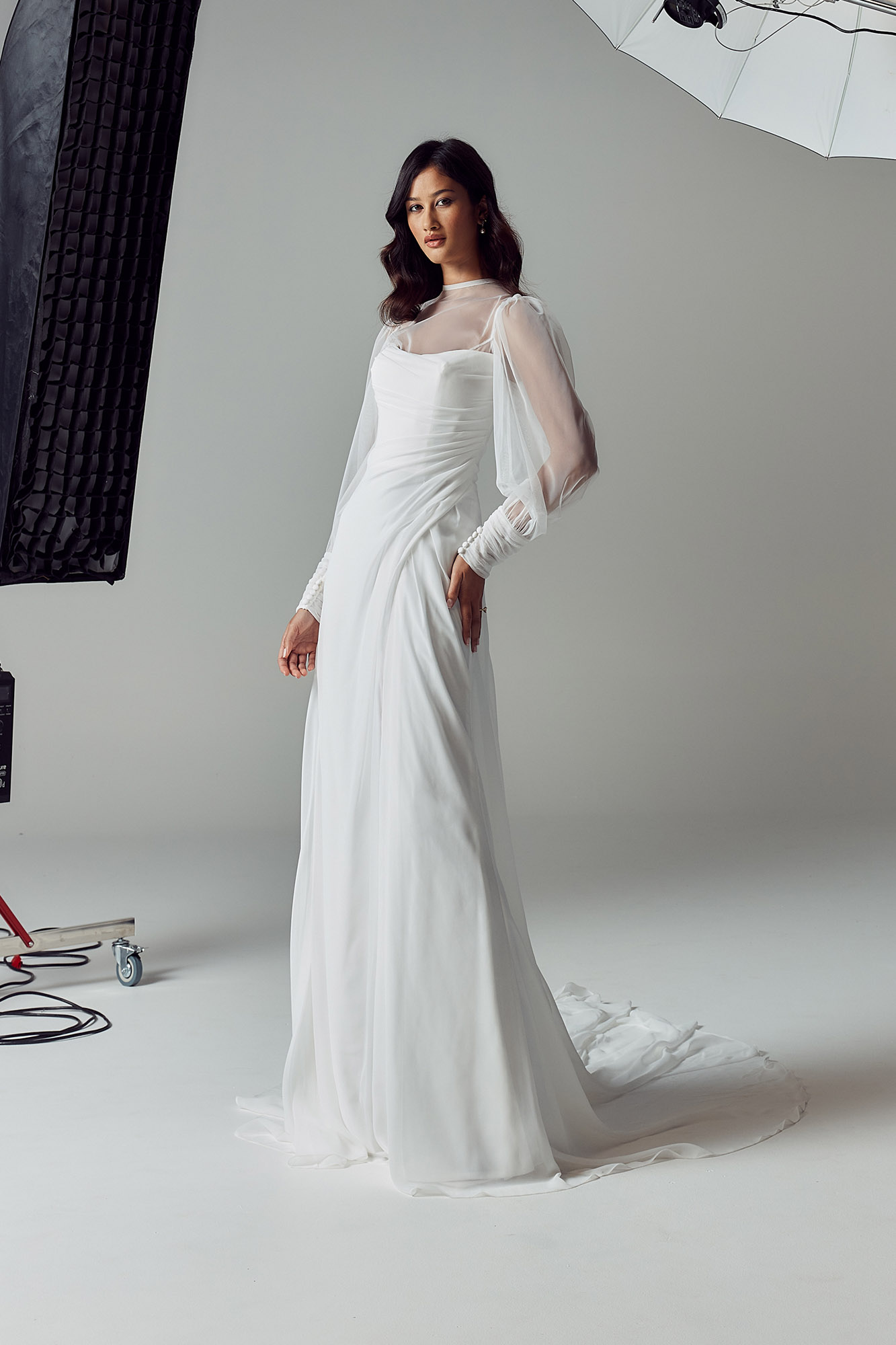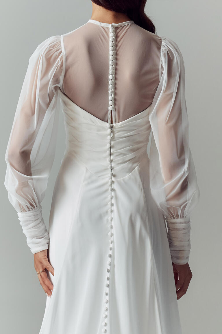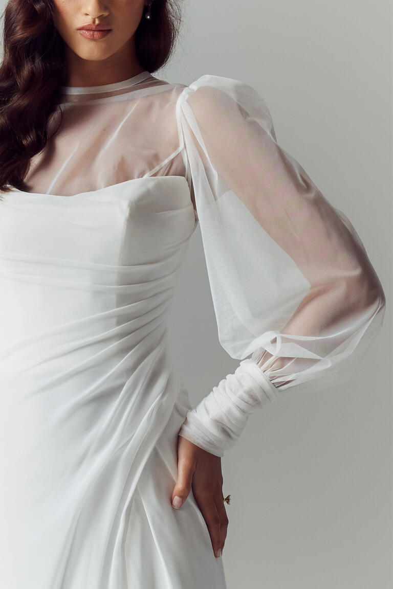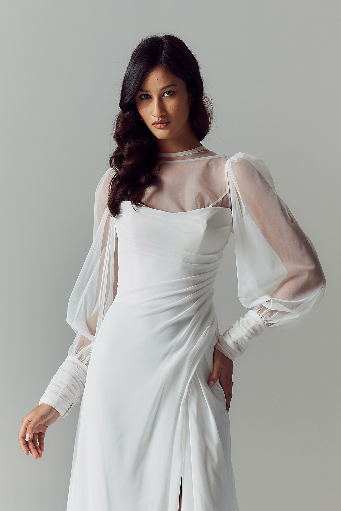 Created with sheer tulle, with a high neck and whimsical blouson sleeves for extra traditional charm. This jacket perfectly balances the sleek minimalism and modernity of the Carolina wedding dress.
