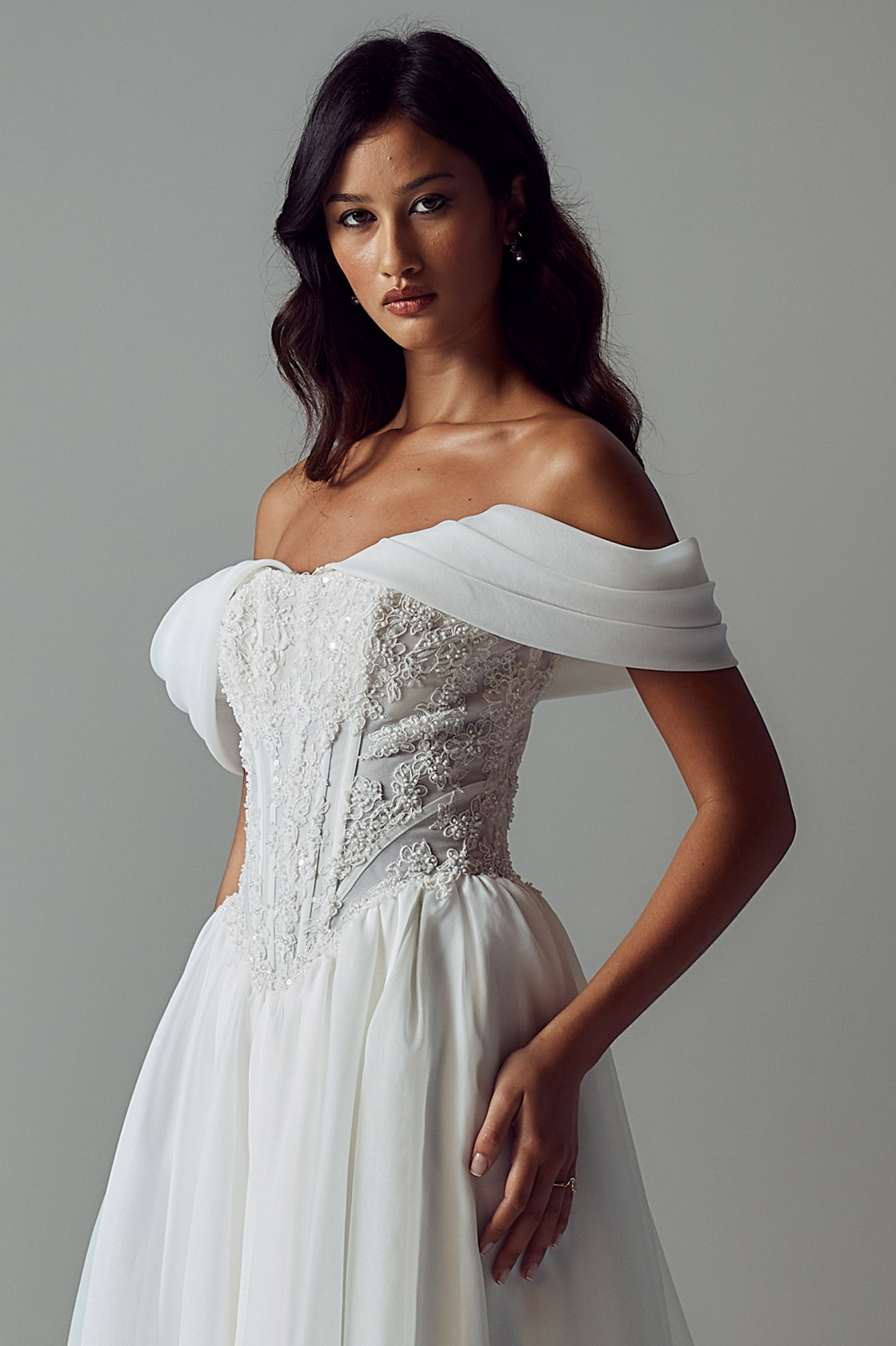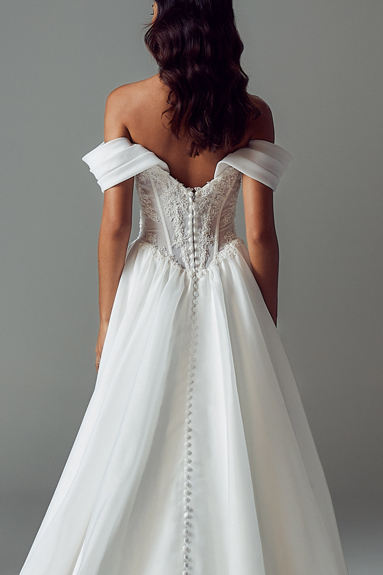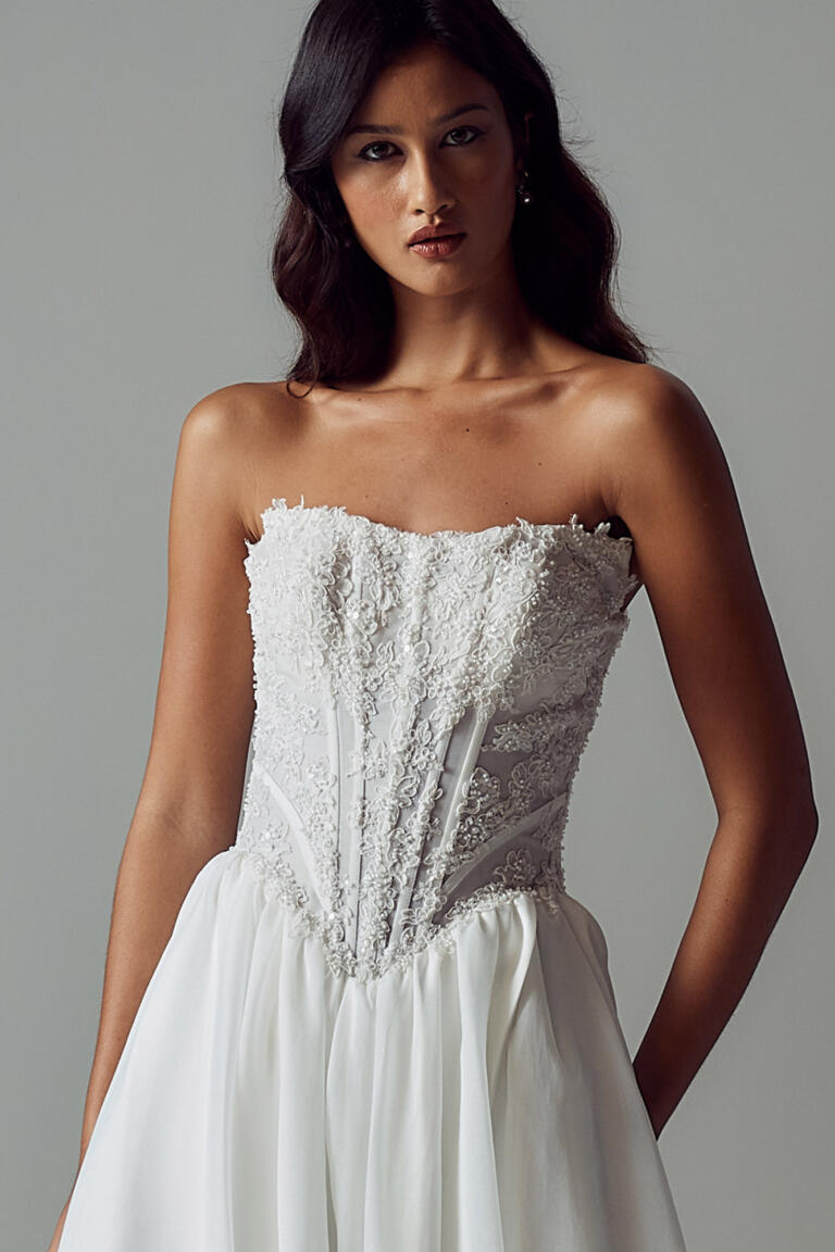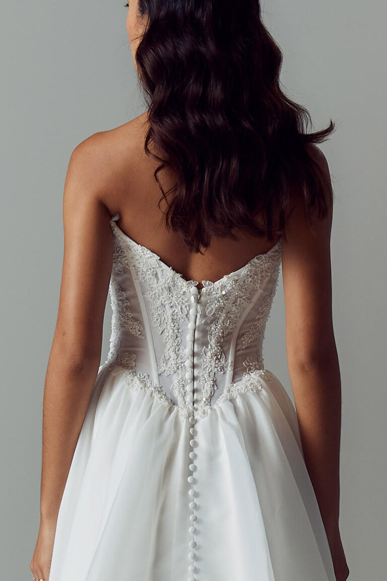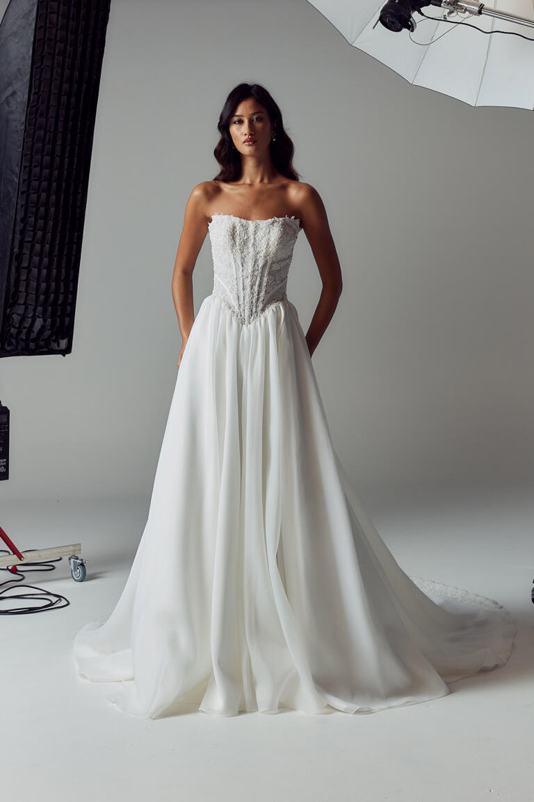 The Basque waist transitions into an airy A-line organza skirt, lightly gathered for volume while keeping the silhouette frothy and light.
