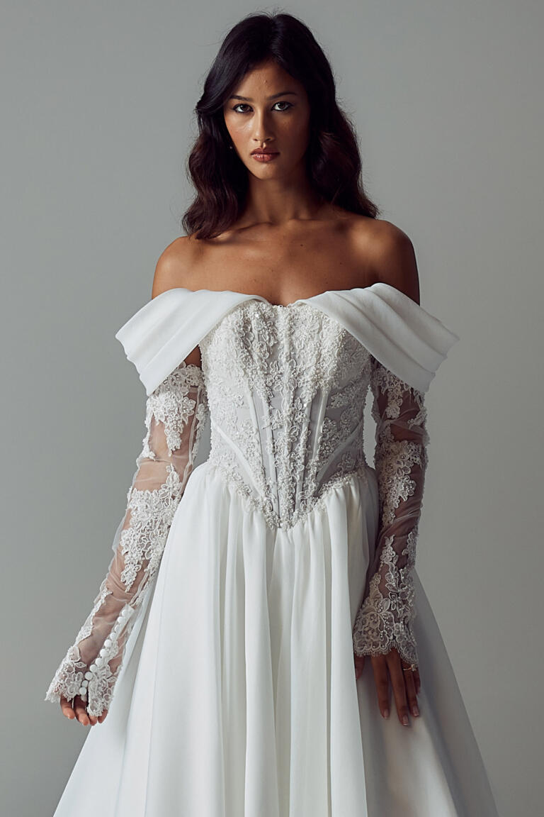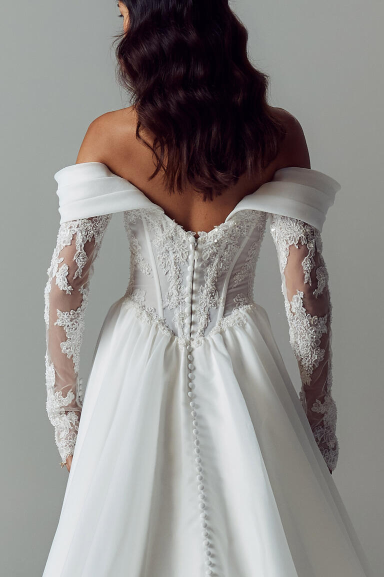 The scoop neckline frames the décolletage, worn strapless for clean elegance or paired with detachable off-shoulder organza straps for a hint of whimsical romance. Long Alençon lace illusion sleeves can be added beneath for extra coverage, layering the look with timeless detail.