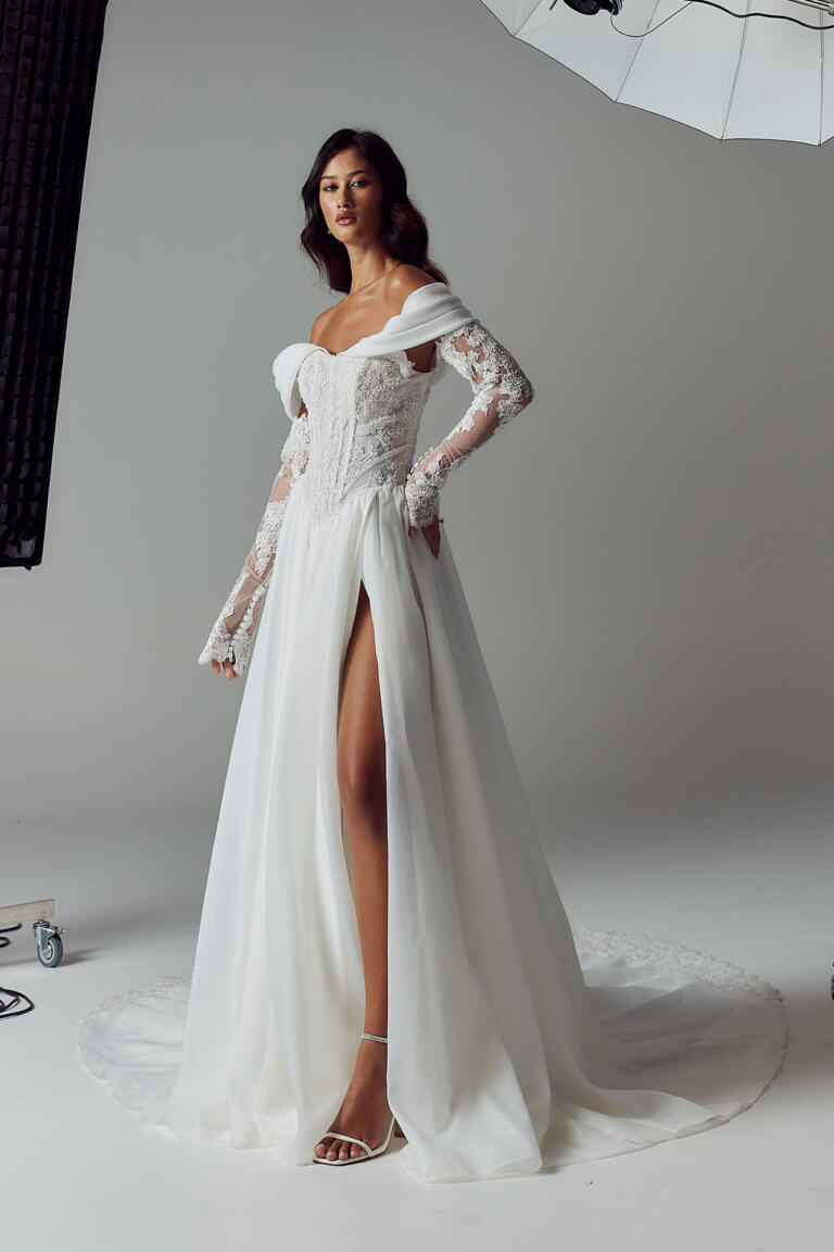 A leg split punctuates the skirt with modern attitude, while the illusion lace train floats behind, adding ethereal texture and elegant drama.