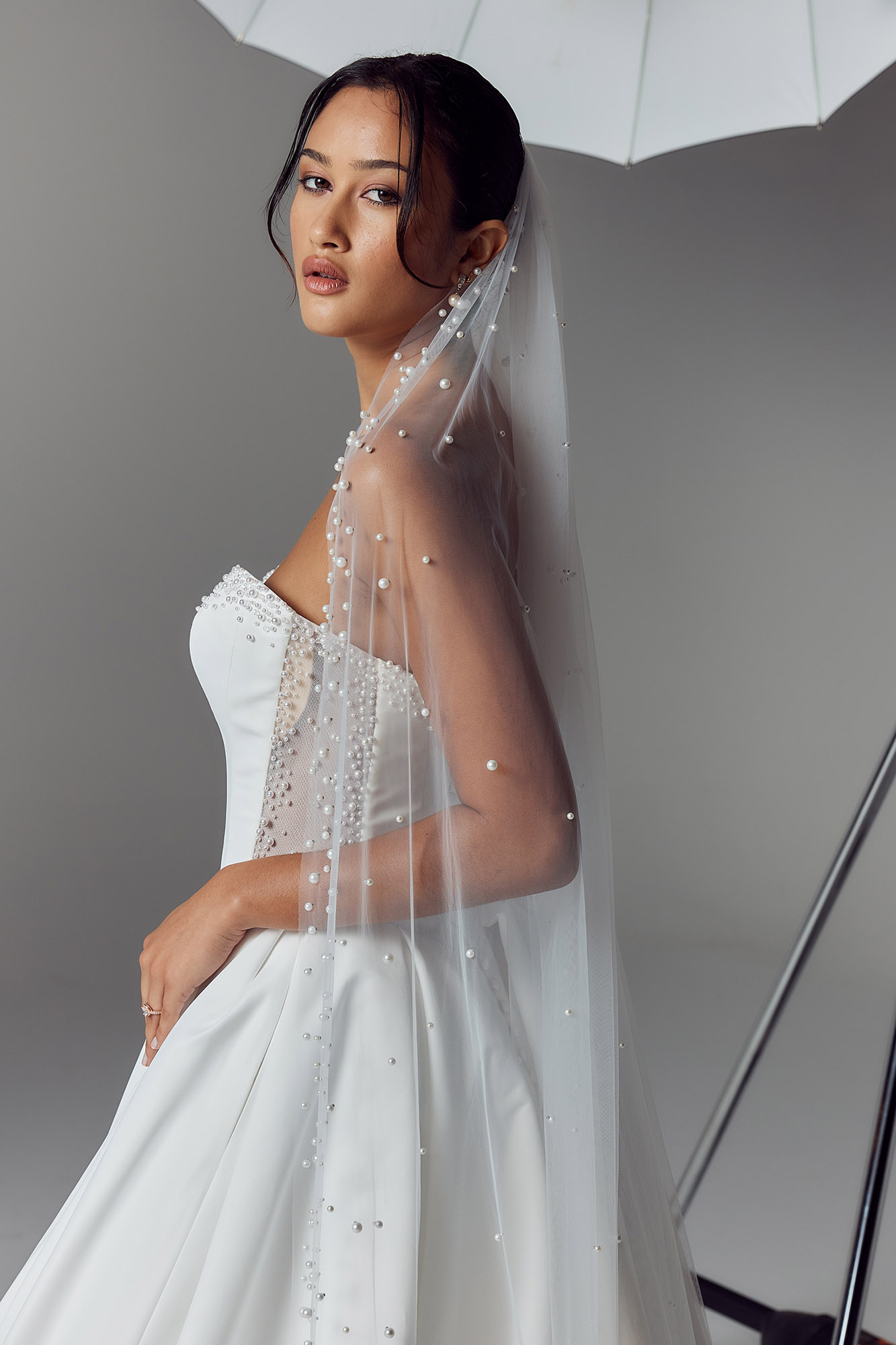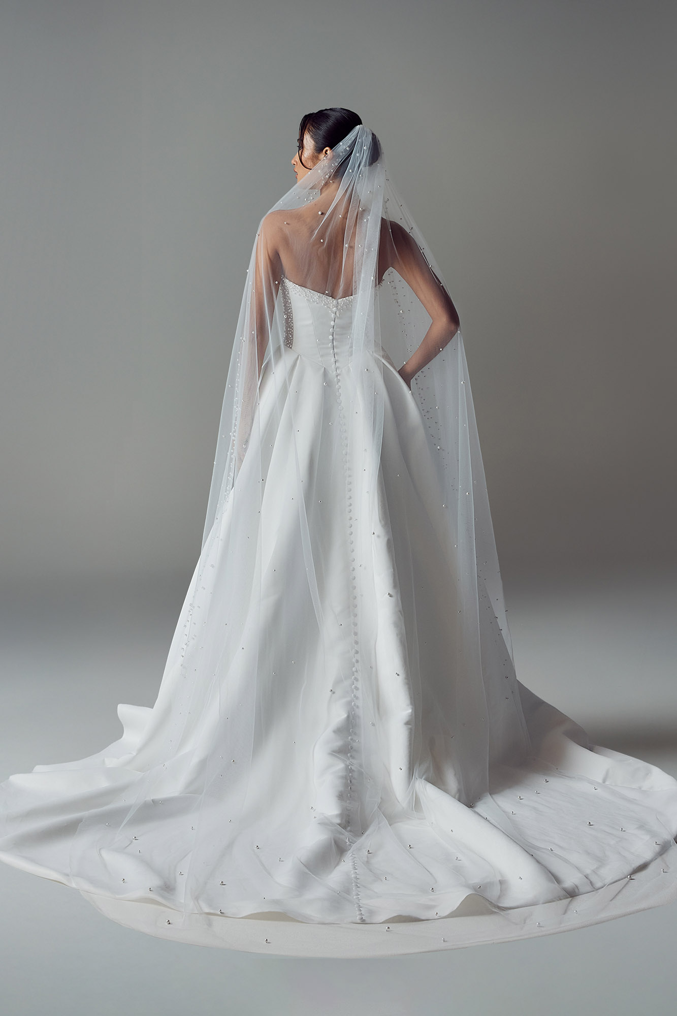 A cathedral length that feels traditional, embellished by scattered pearl bead details.