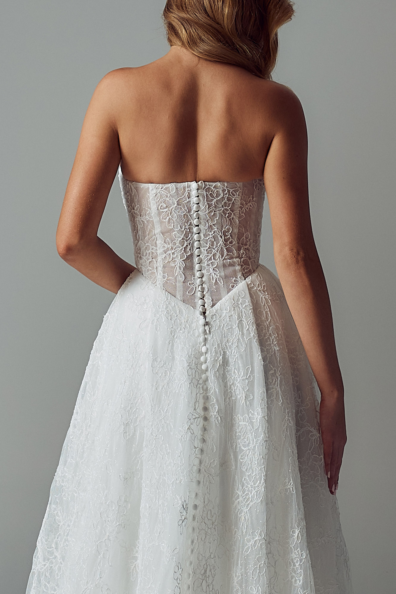 A chic straight and strapless neckline gives the gown a modern edge. The bodice entirely illusion and embellished pearl-beaded Chantilly lace.