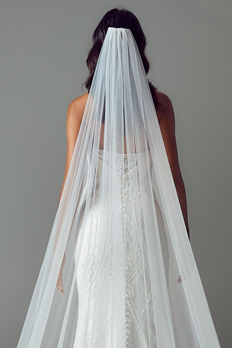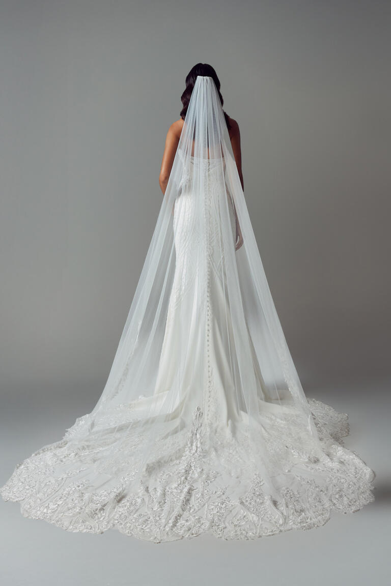 Crafted in tulle and romantic embroidered motifs that concentrate around the hem. This veil perfectly complements our Janie Wedding dress for a sense of continuity in every detail of the final look.