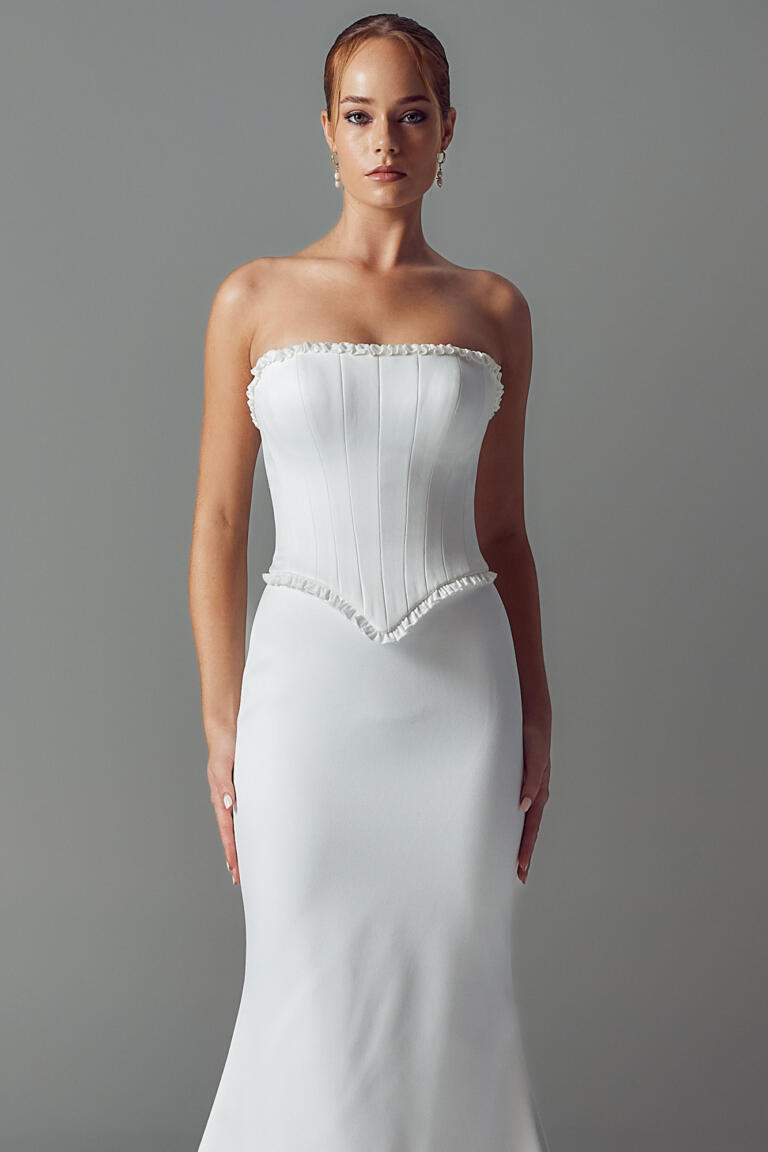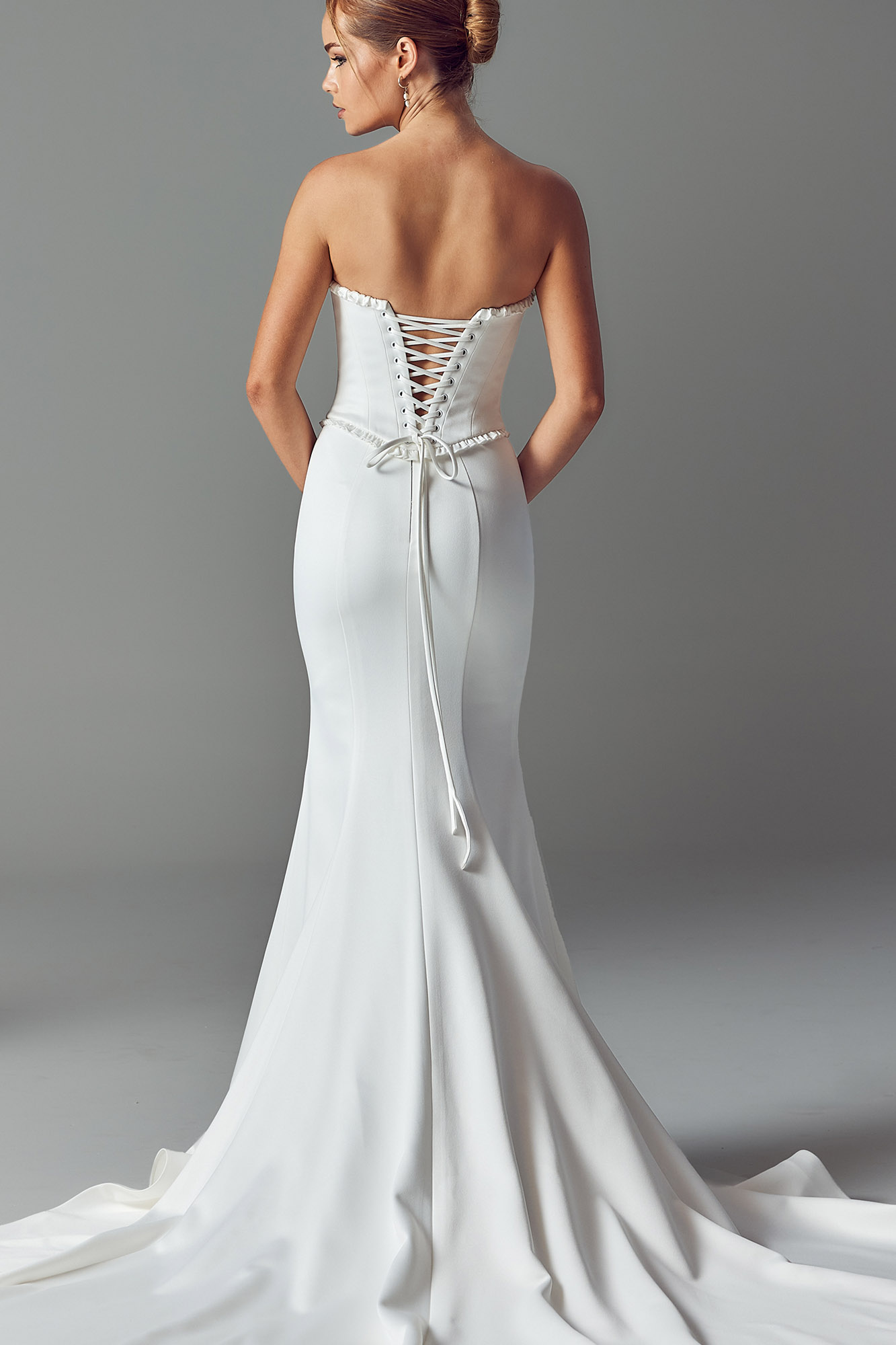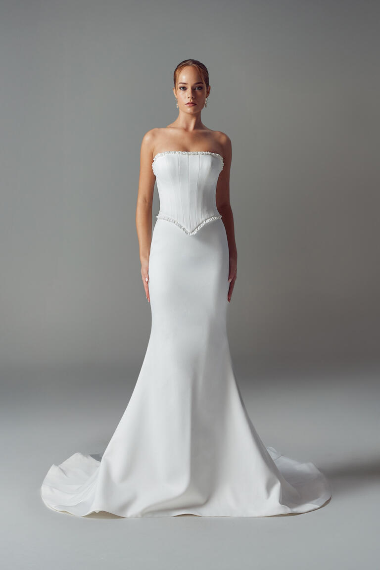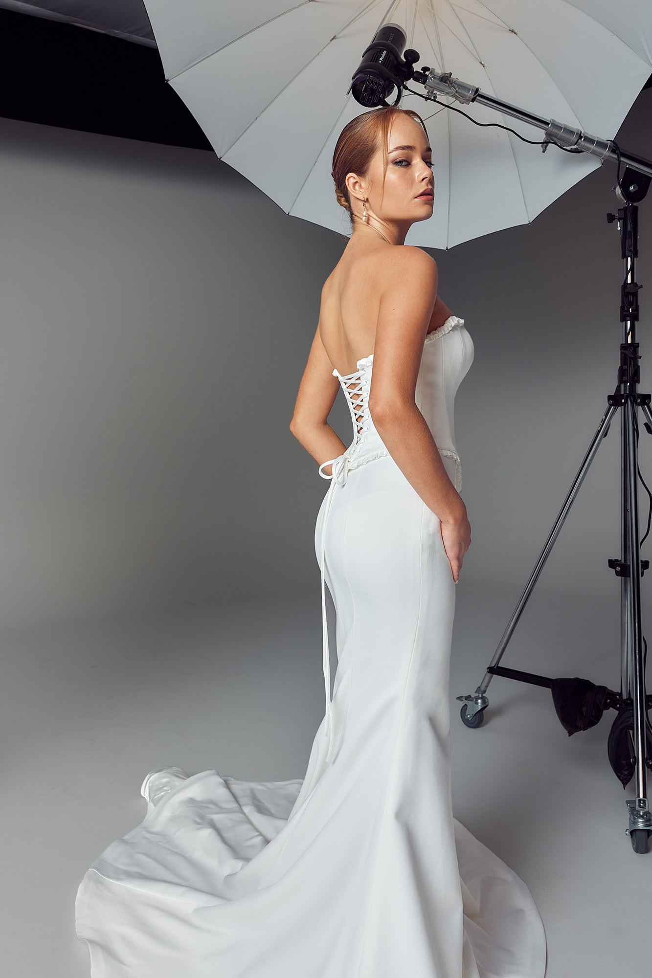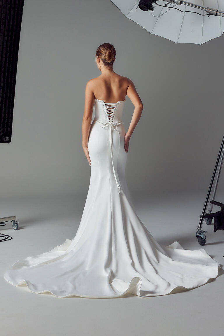 The sleek satin hugs the body through the hips, flaring below the knee for a streamlined look that feels fluid. Designed to be completely simple and clean for the ultimate, effortless minimalist bride.