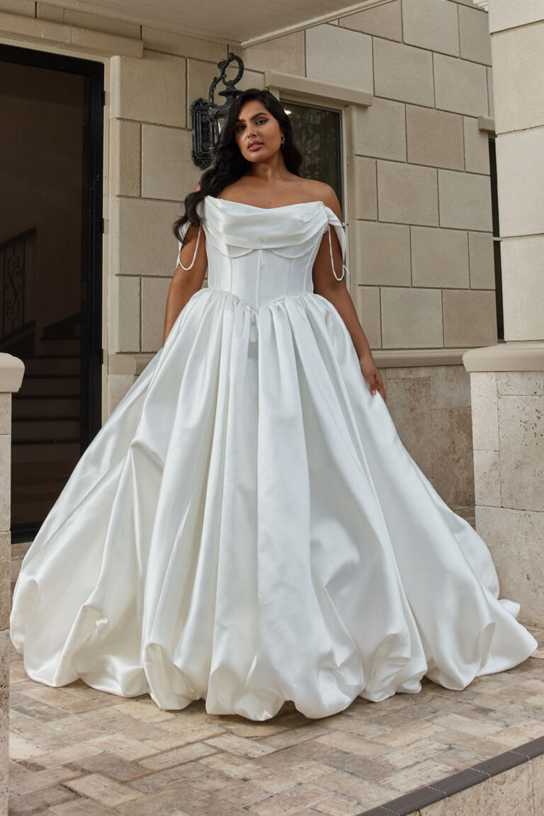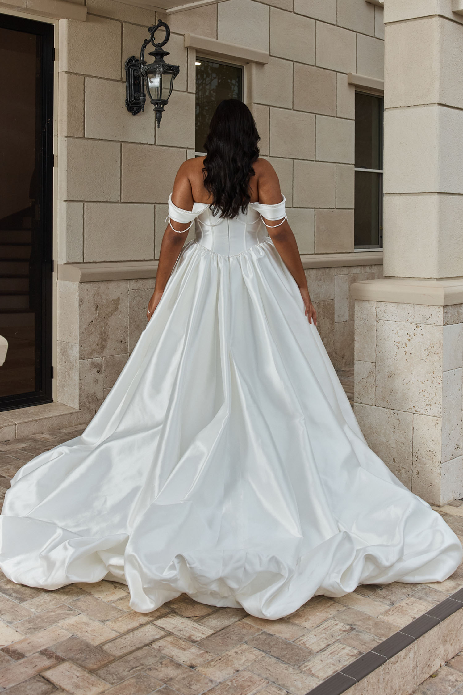 The full, A-line skirt is perfectly voluminous. Created with gathers at the waist around the hips, and a trendy modern bubble hem. Making the dress appear to be floating over the floor around the bride.