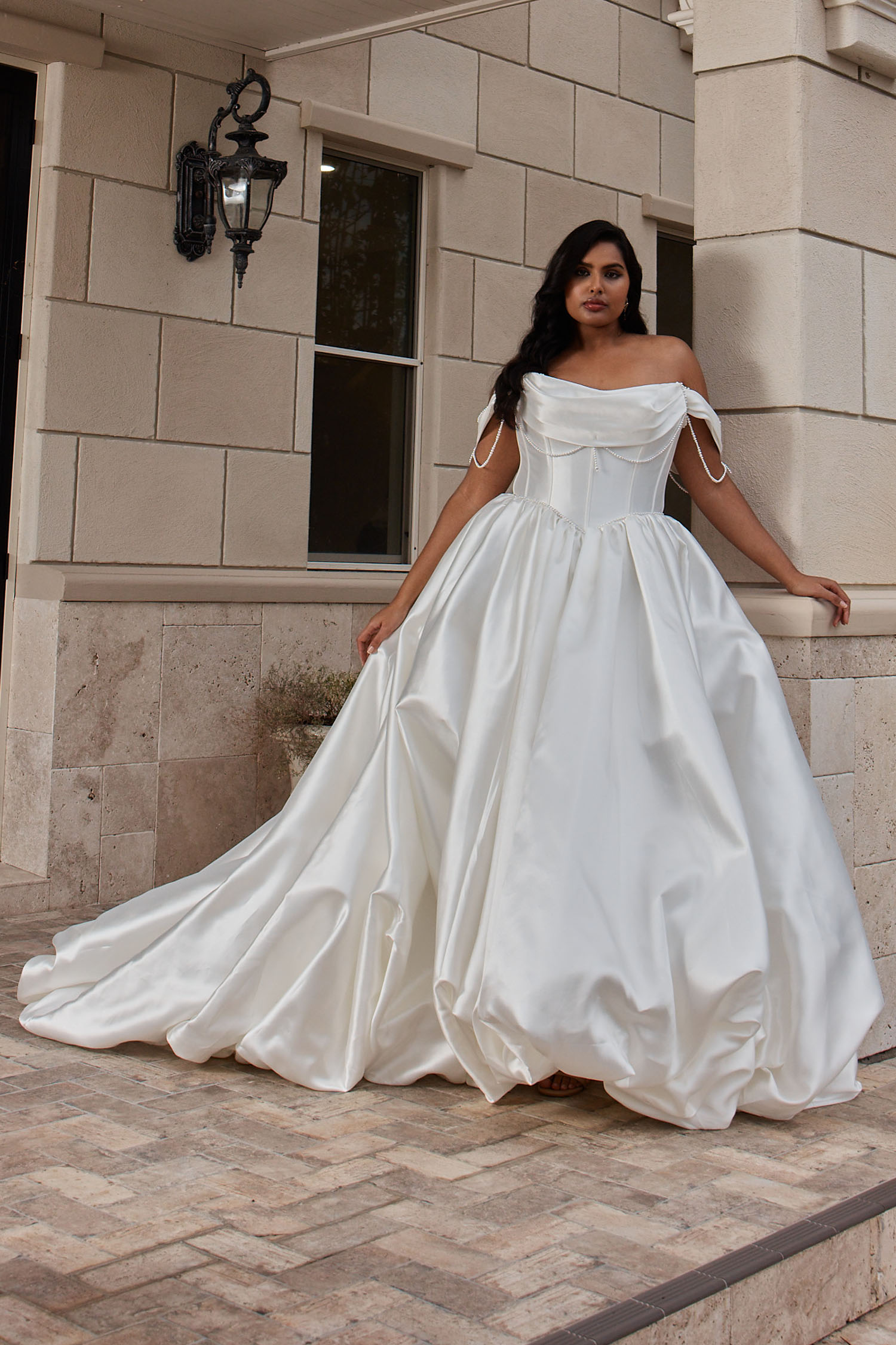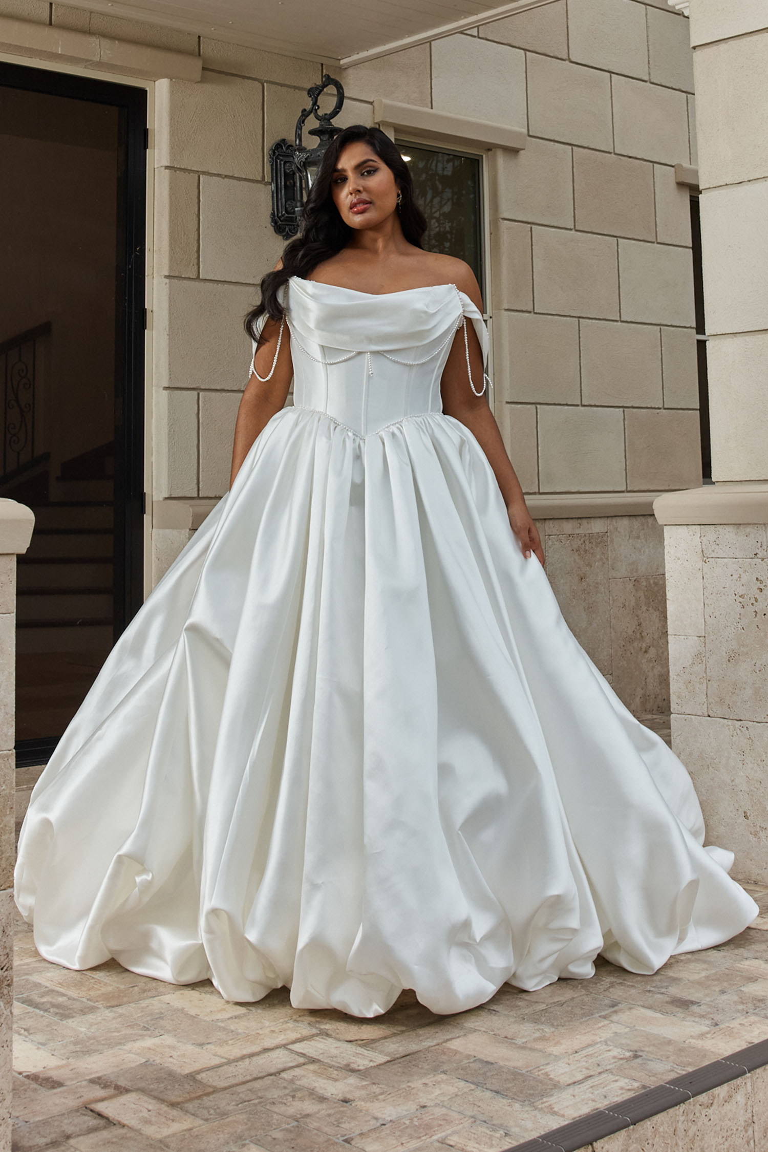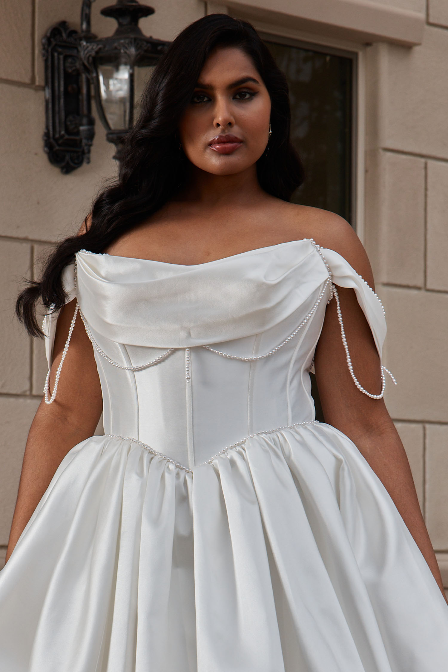 The bodice features a scoop neckline with a pleated bust drape design, trimmed with pearl beads, continuing into off-shoulder straps. Draped pearls sit under the line of the bust, adding detail and vintage charm. The bodice is shaped with curved exposed boning and a pointed Basque waist. These elements cinching the figure for the most feminine silhouette.
