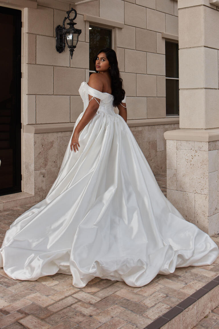 This bubble effect continues around through the dramatic train, adding a modern statement to the classic shape of the design.