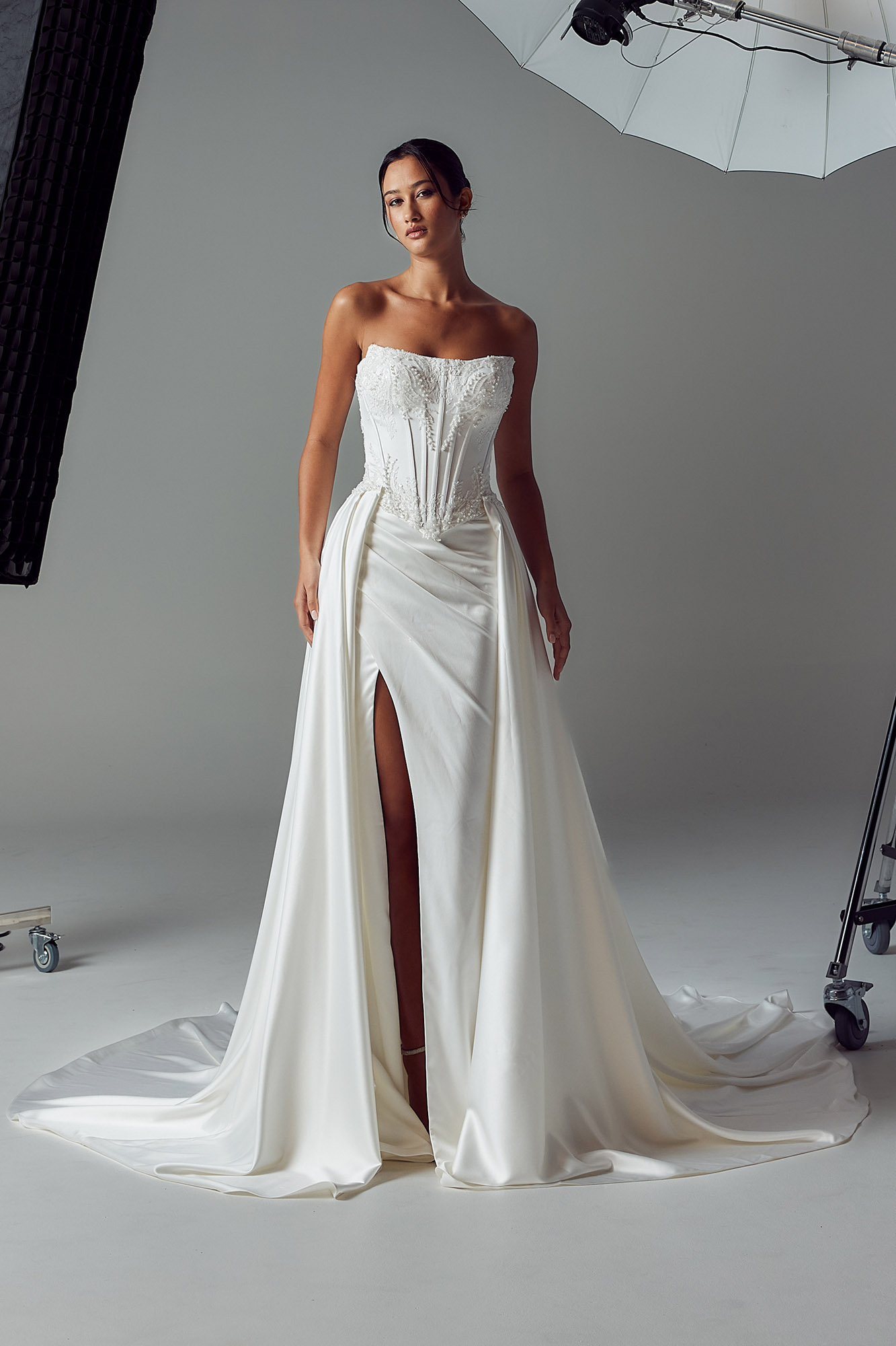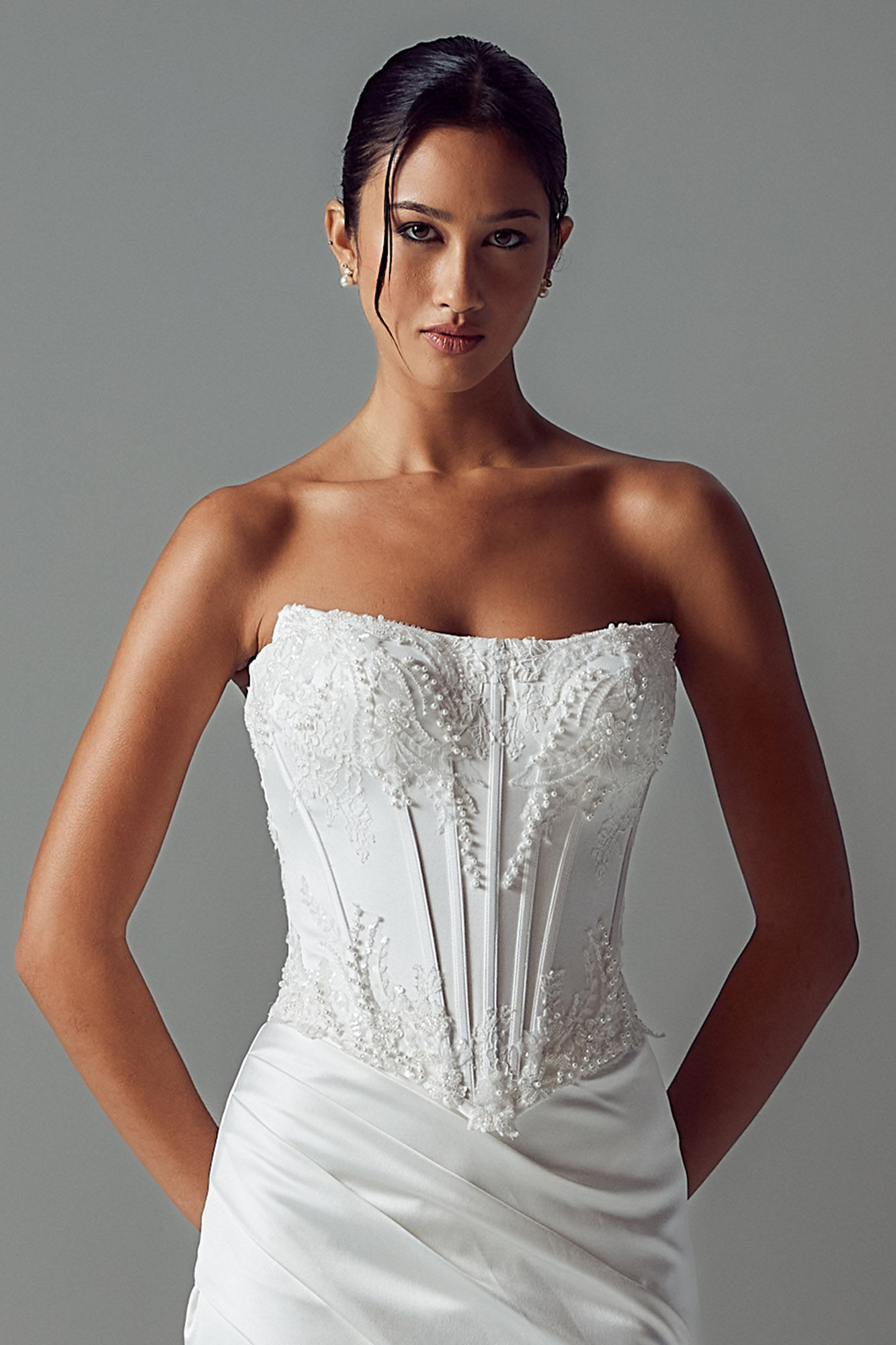 Comprised of clean satin and embellished by ornate lace designs, our Joanie Bodice is the answer for modern romantic brides.