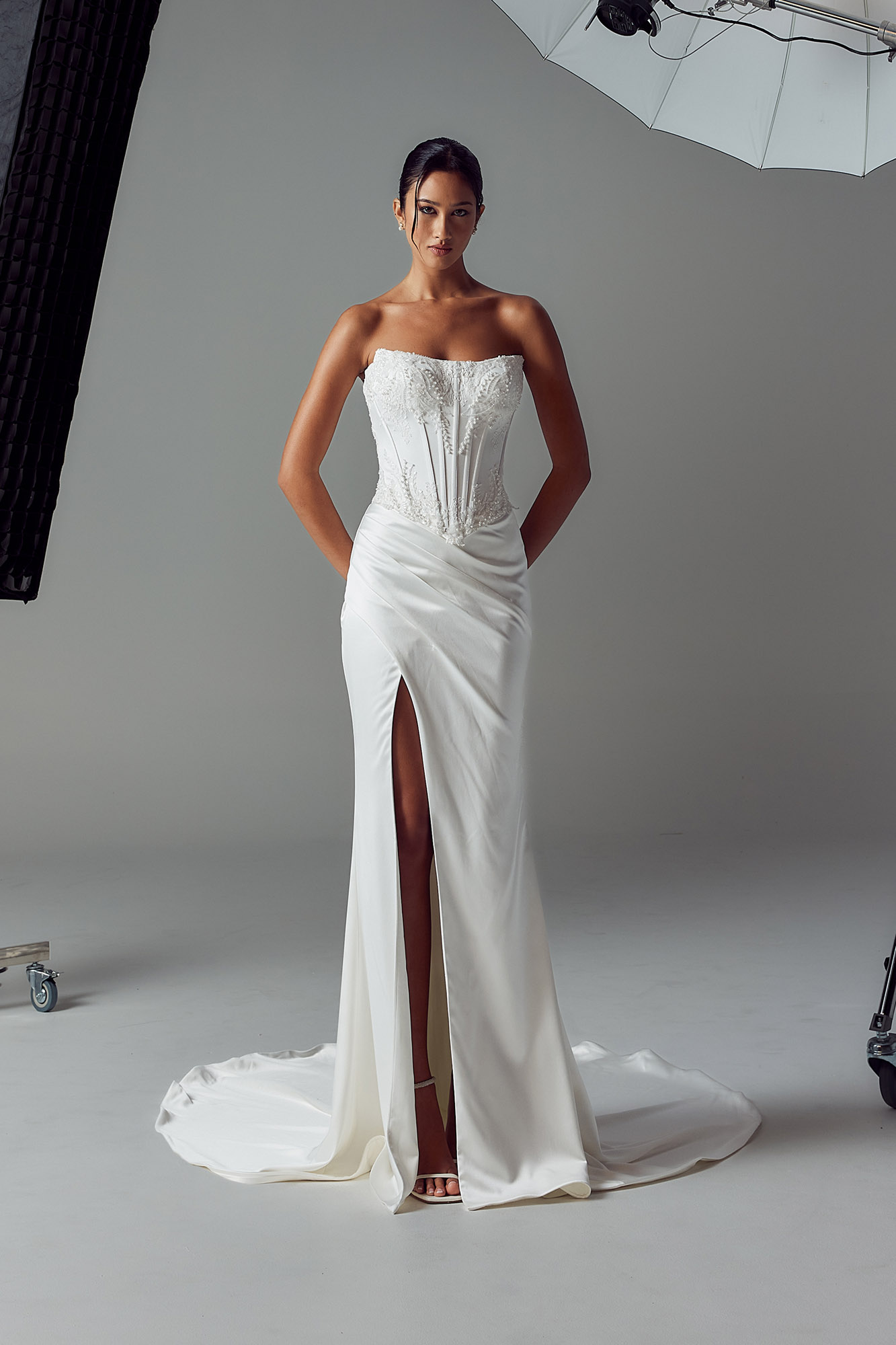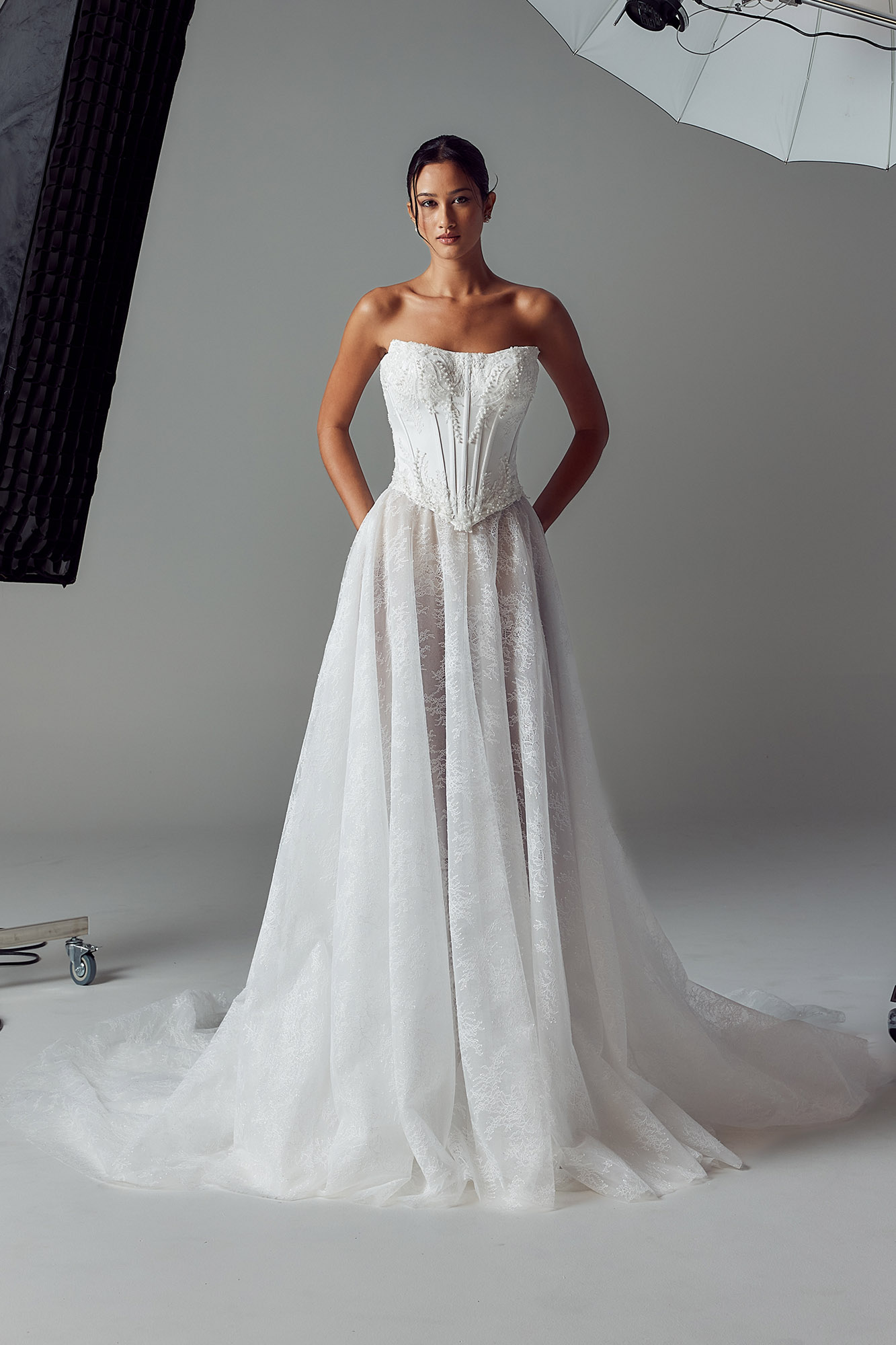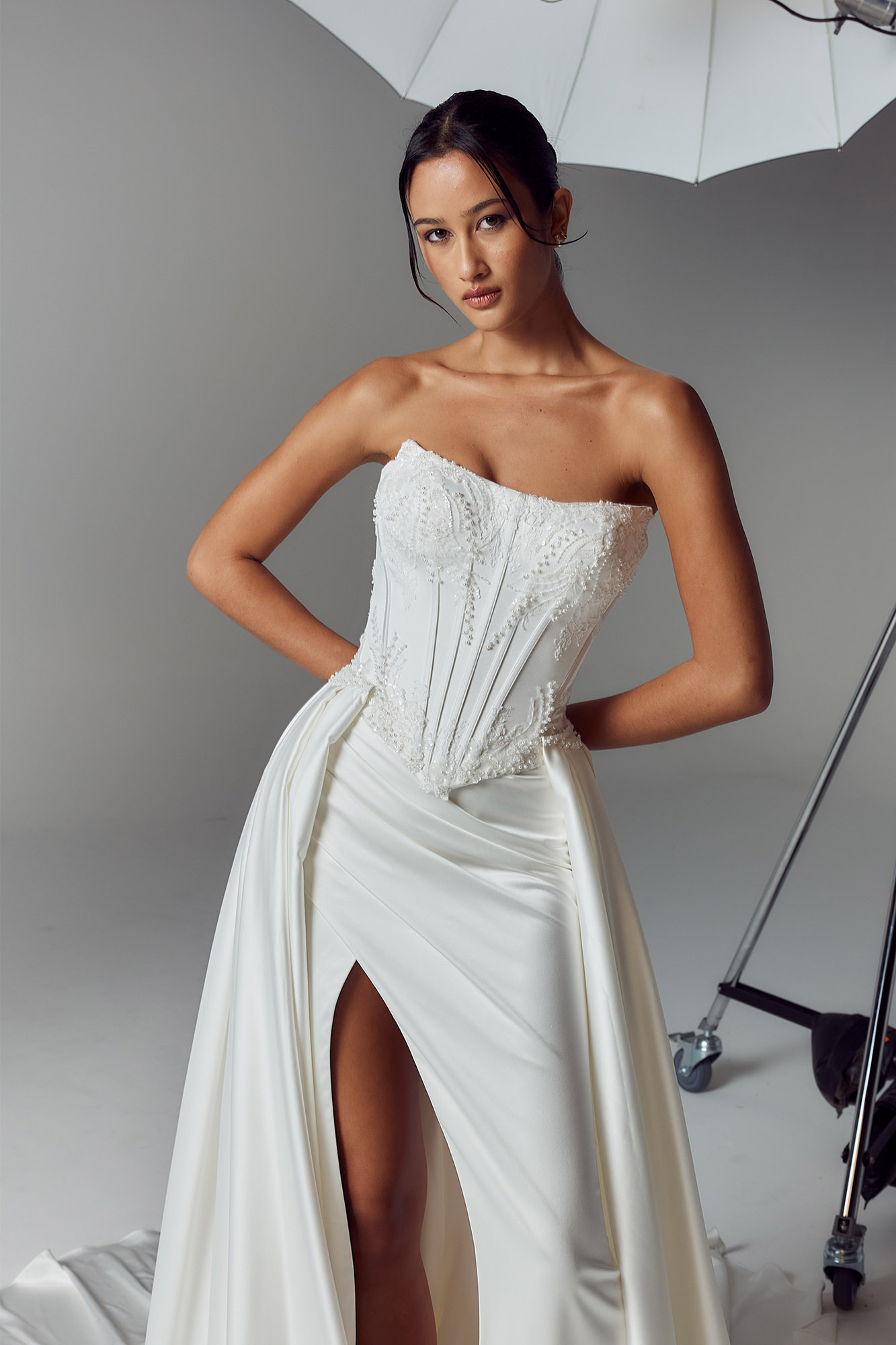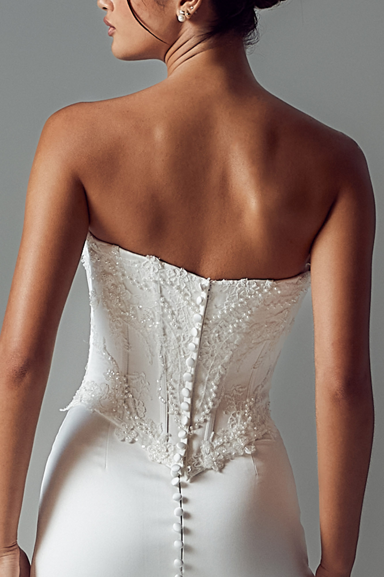 Designed to offer a romantic, chic silhouette with contemporary edge. This bodice features a modern, strapless, square neckline with exposed boning that shapes the figure.