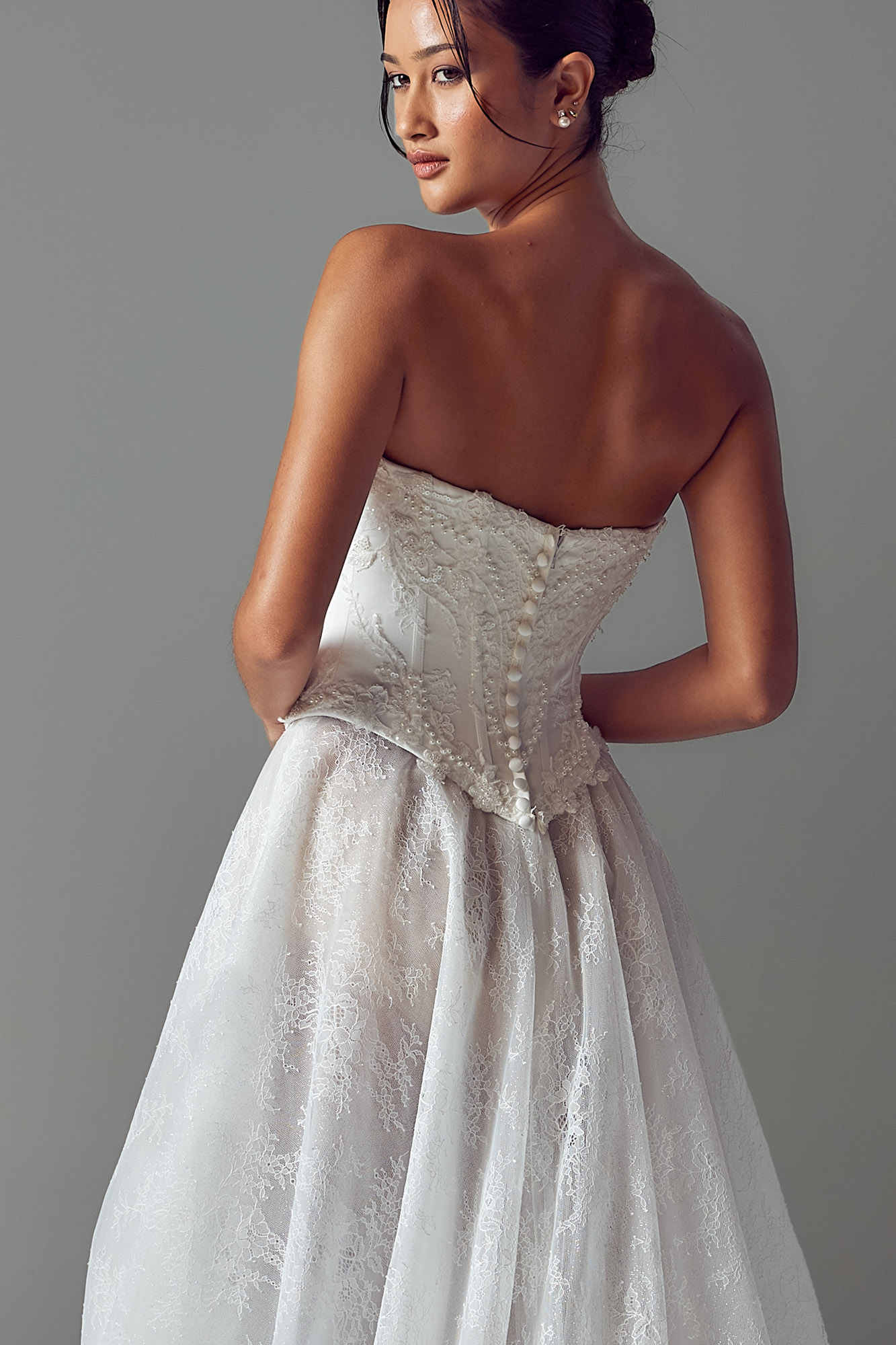 Detailed with beaded lace motifs that frames the bodice and balances the minimalist fabric. These bold lace motifs continuing around to the back of the bodice for continuity through the entire design.
