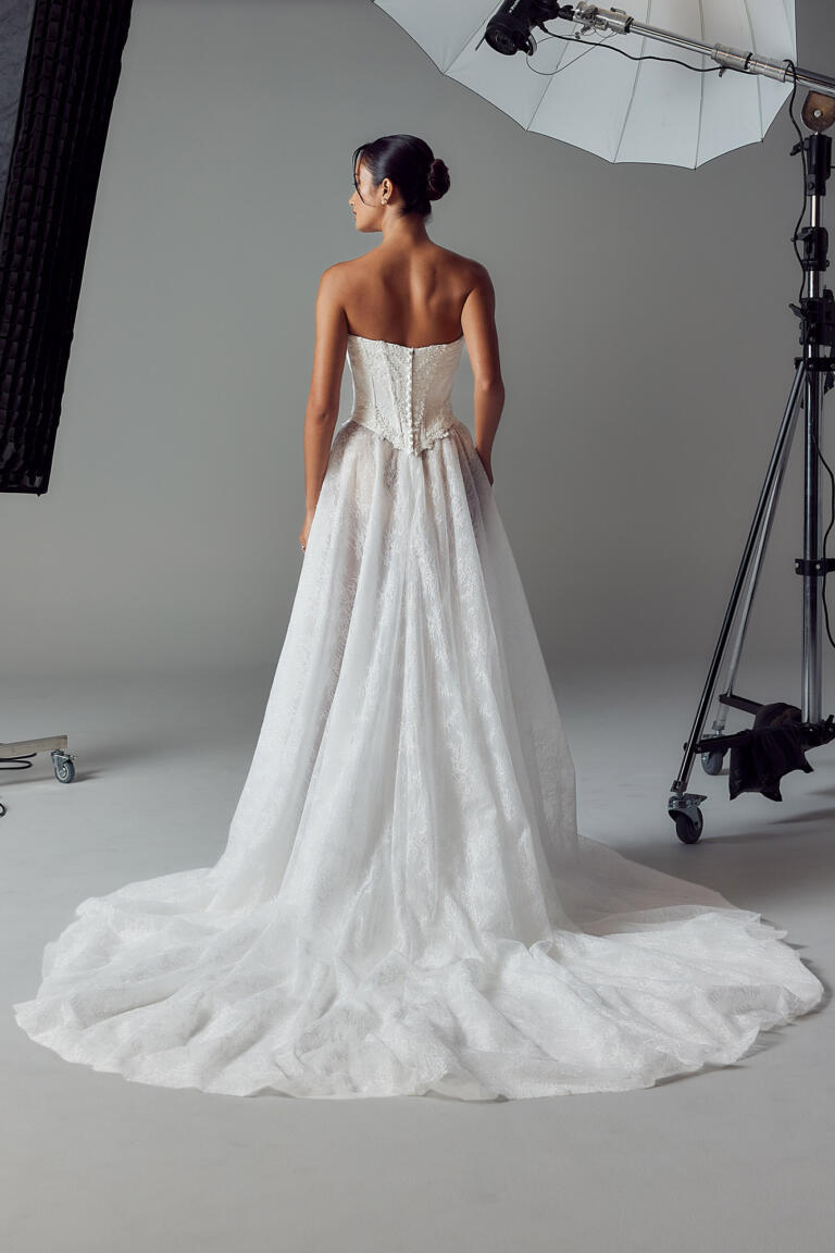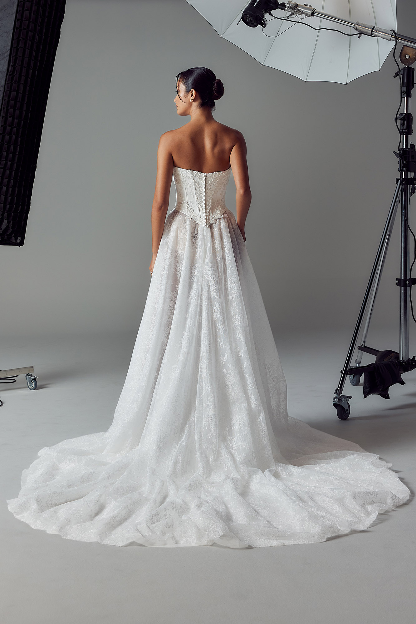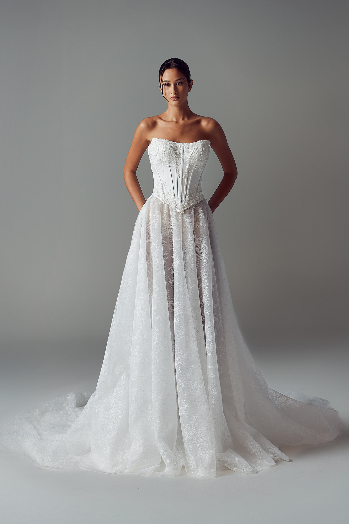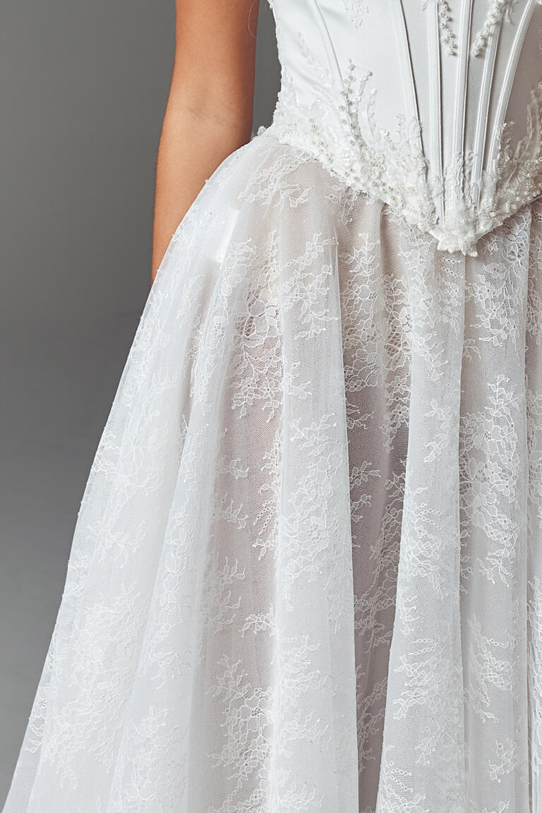 A classically bridal, A-line shape with a modern sheer effect. Movement and volume is created throughout the layers of the skirt from the gathers at the waist.