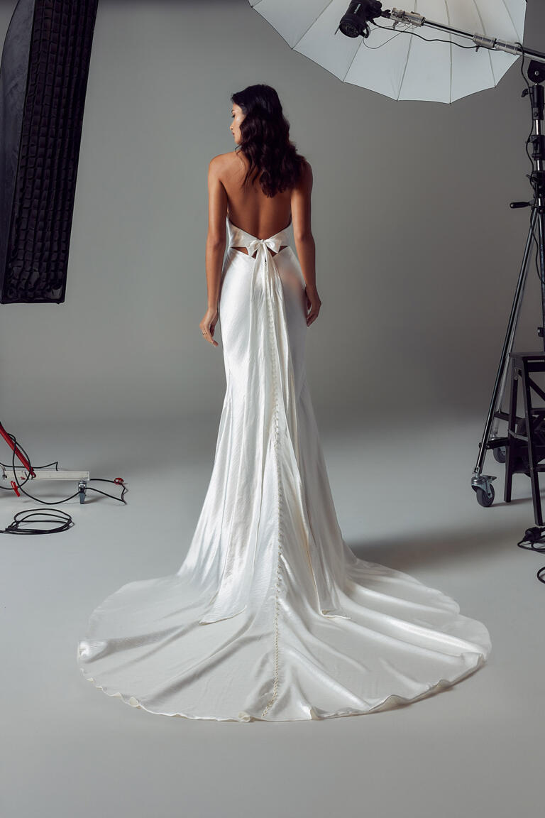 To the back of the gown, another statement is made in the low, open back. Detailed with a tie back that adds a romantic element, while useful in cinching the waist. A keyhole effect is made where the tie sits. Creating simple, clean detailing that doesn’t distract from the bombshell silhouette.