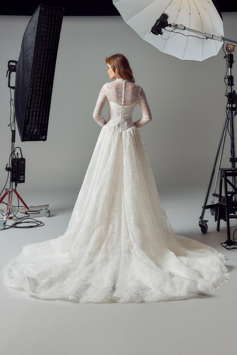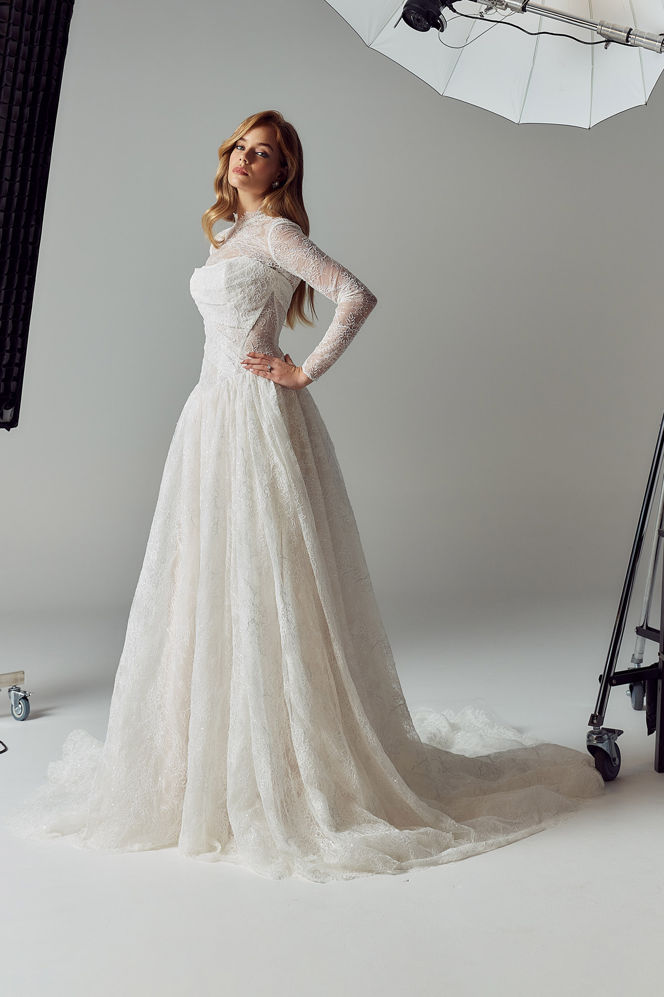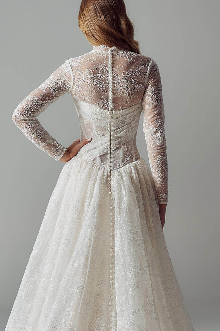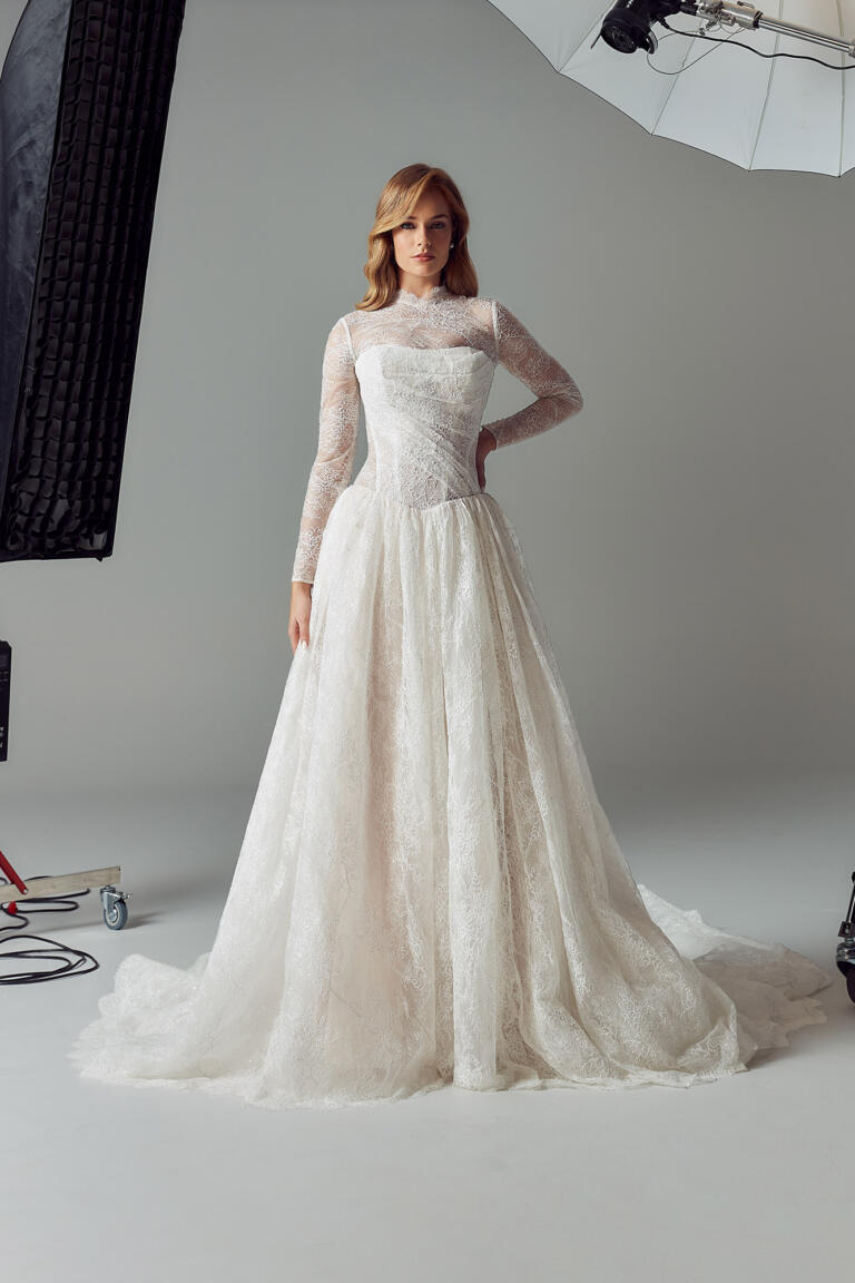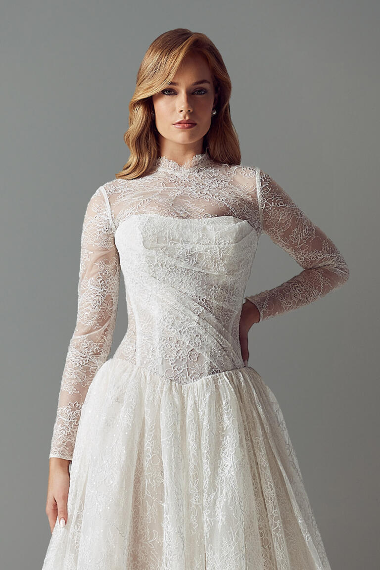 Crafted in corded Chantilly lace with a high neckline and completely illusionary as not to overpower the look.