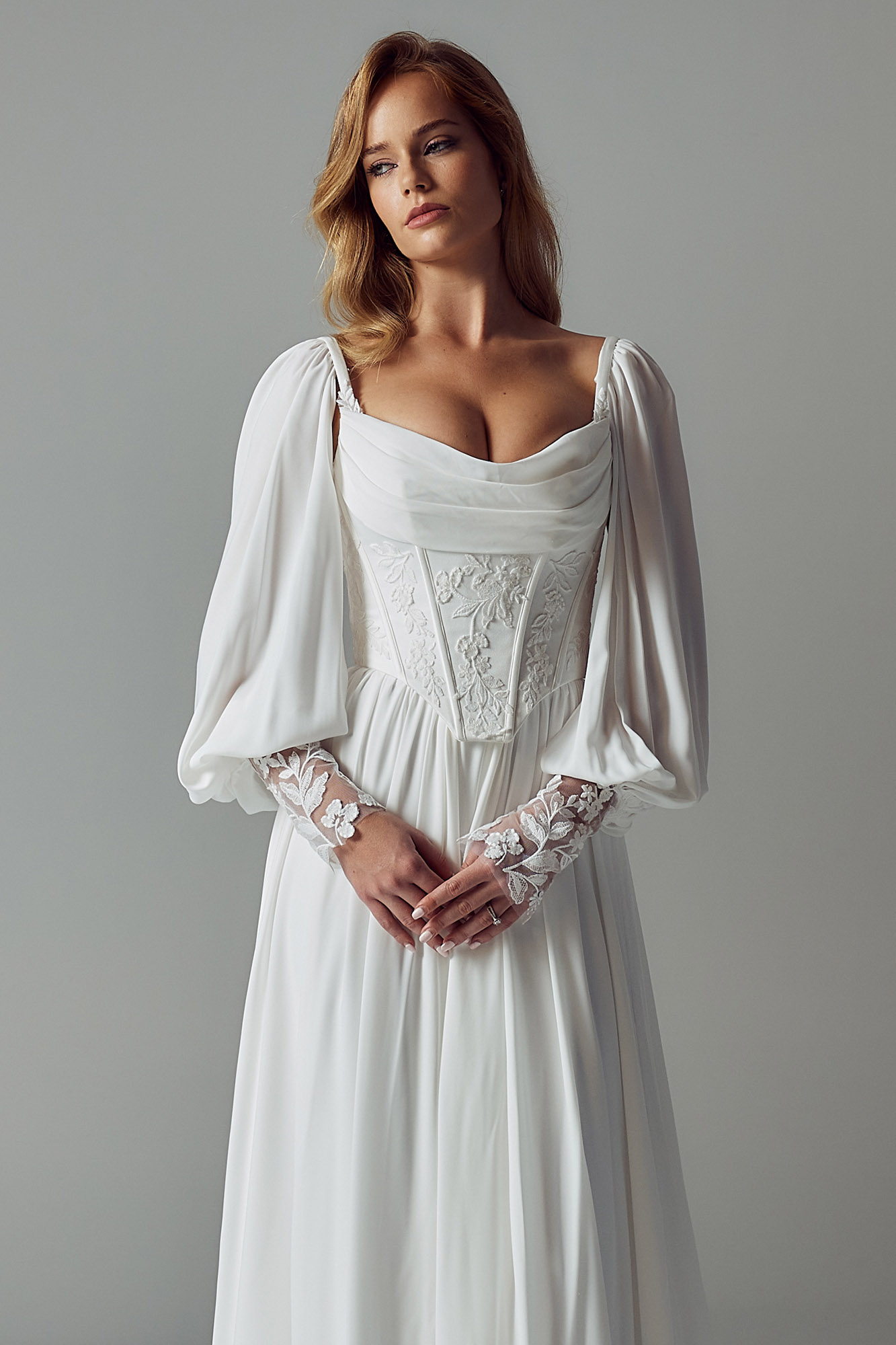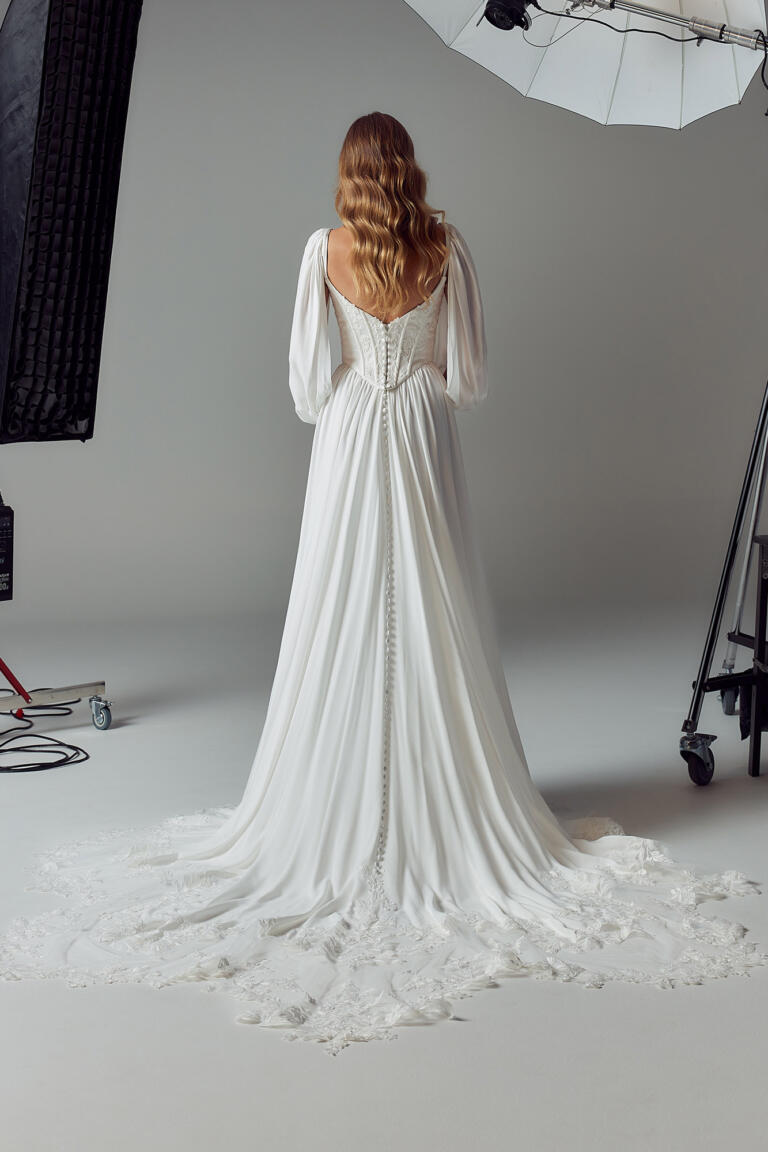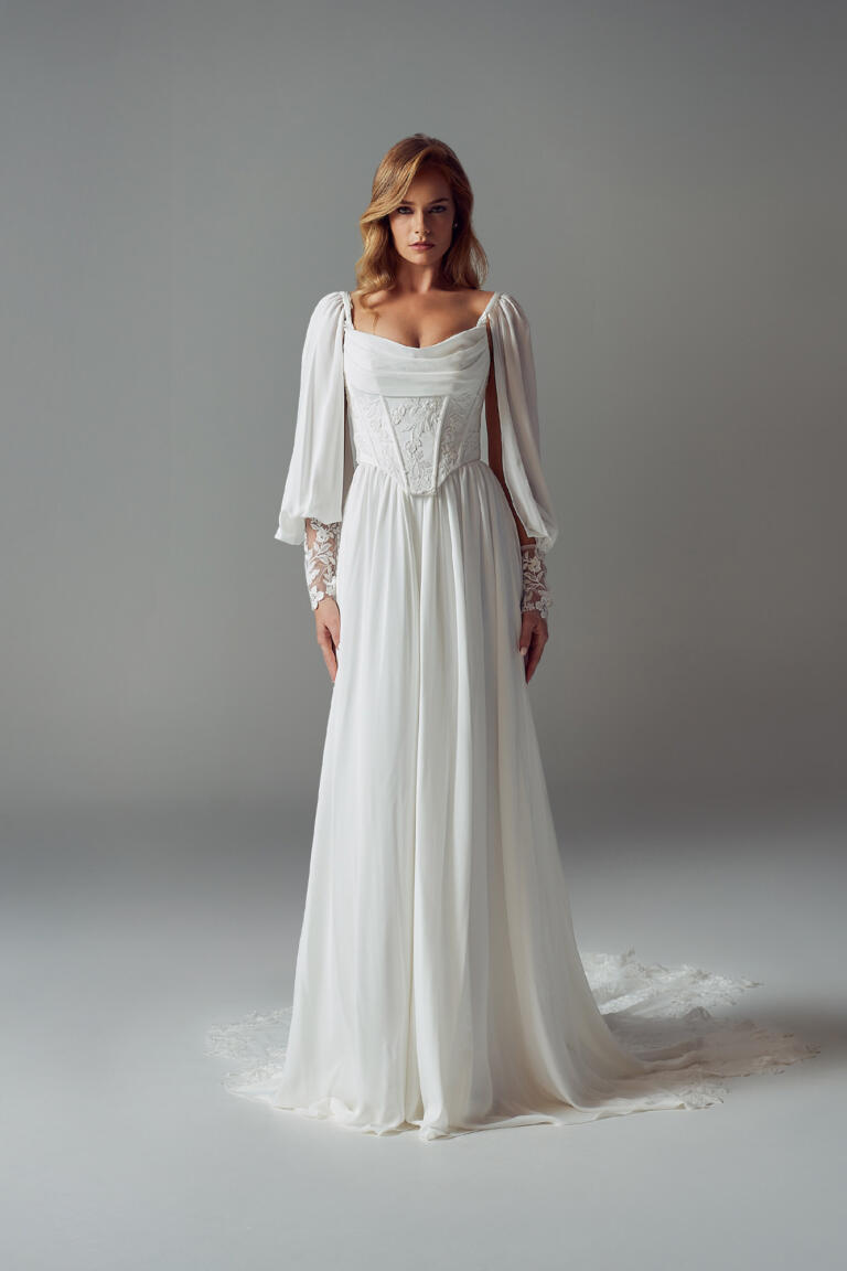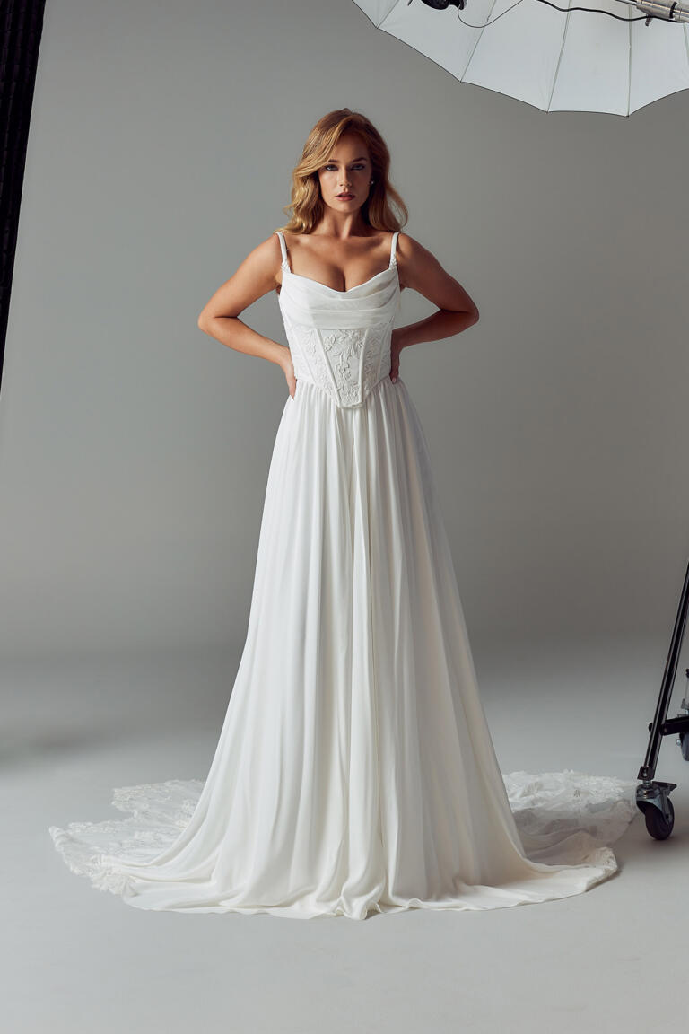 Exposed boning throughout the bodice adds structure to the flowy design, while drawing in and cinching the waist. The bodice finishes at a contemporary squared Basque waistline. From under which falls the soft, delicate chiffon skirt in a slim A-line silhouette.