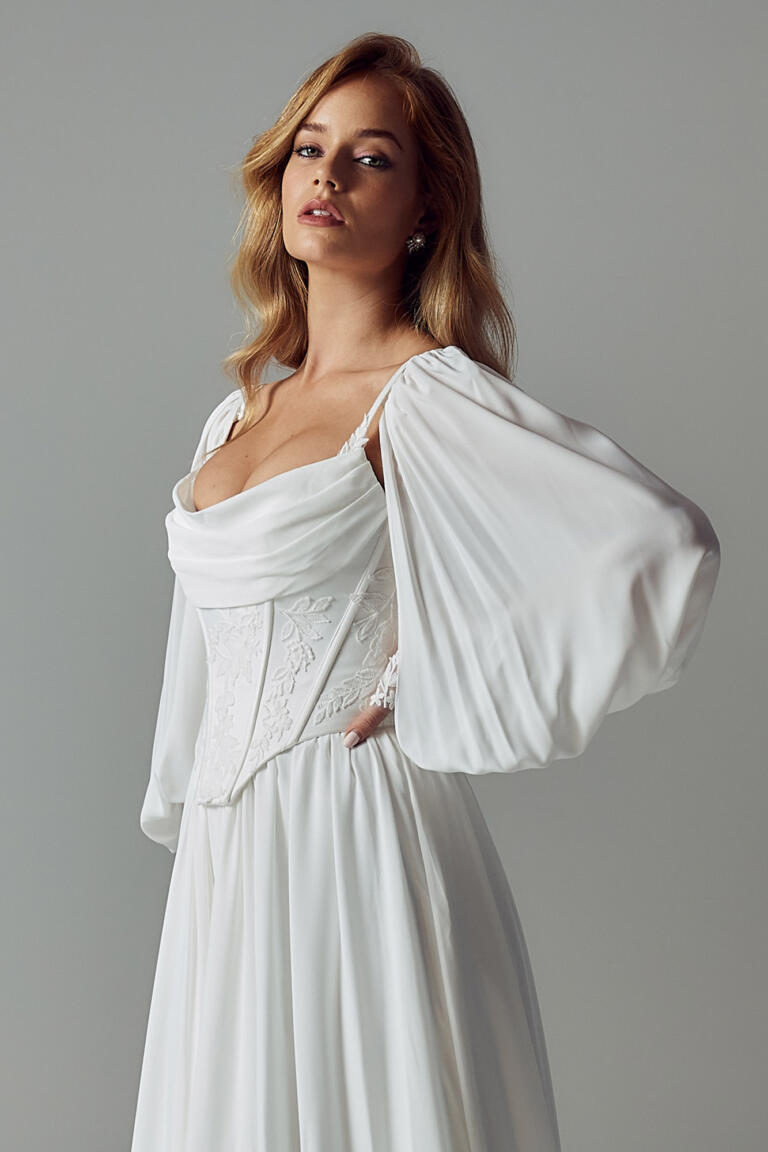 A faux separates look crafted in smooth velvet satin and delicate Euro chiffon. This dress is modern-minimalist, with vintage-inspired sleeves and airy romantic details that make the design feel ethereal and effortless.