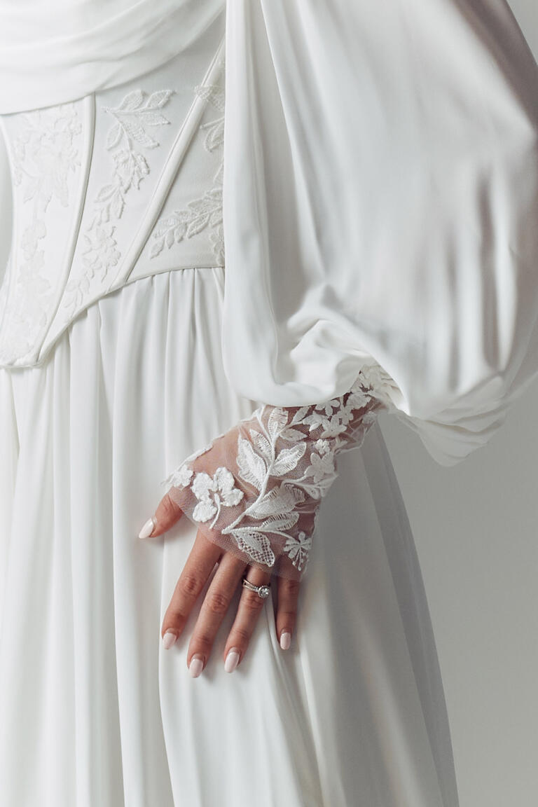 The bodice is supported by thin straps to frame the decolletage for a streamlined, effortless look. With the option to style the dress with the matching blouson Ophelia Sleeves. The sleeves are crafted in. light chiffon to carry through the minimalism of skirt. Gathered at the thick lace cuffs beginning at the mid-forearm and extend to rest over the knuckles. These sleeves offering the look an additional, feminine statement and styling versatility for multiple looks in one.