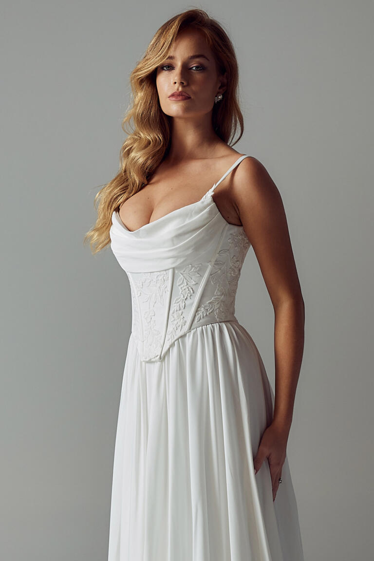 The corset-style bodice is detailed with a modern scoop neckline and draped cowl bust. Embellished by embroidered, floral motifs across the waist while adding a touch of texture to the clean fabric.