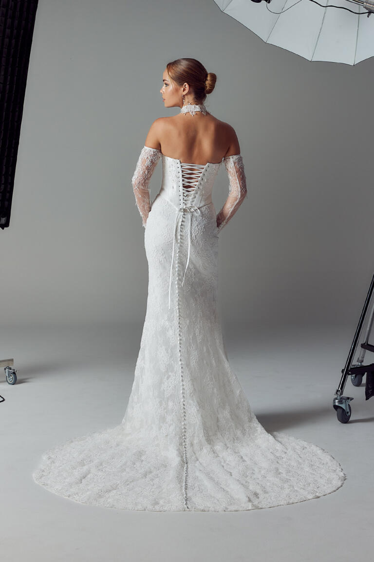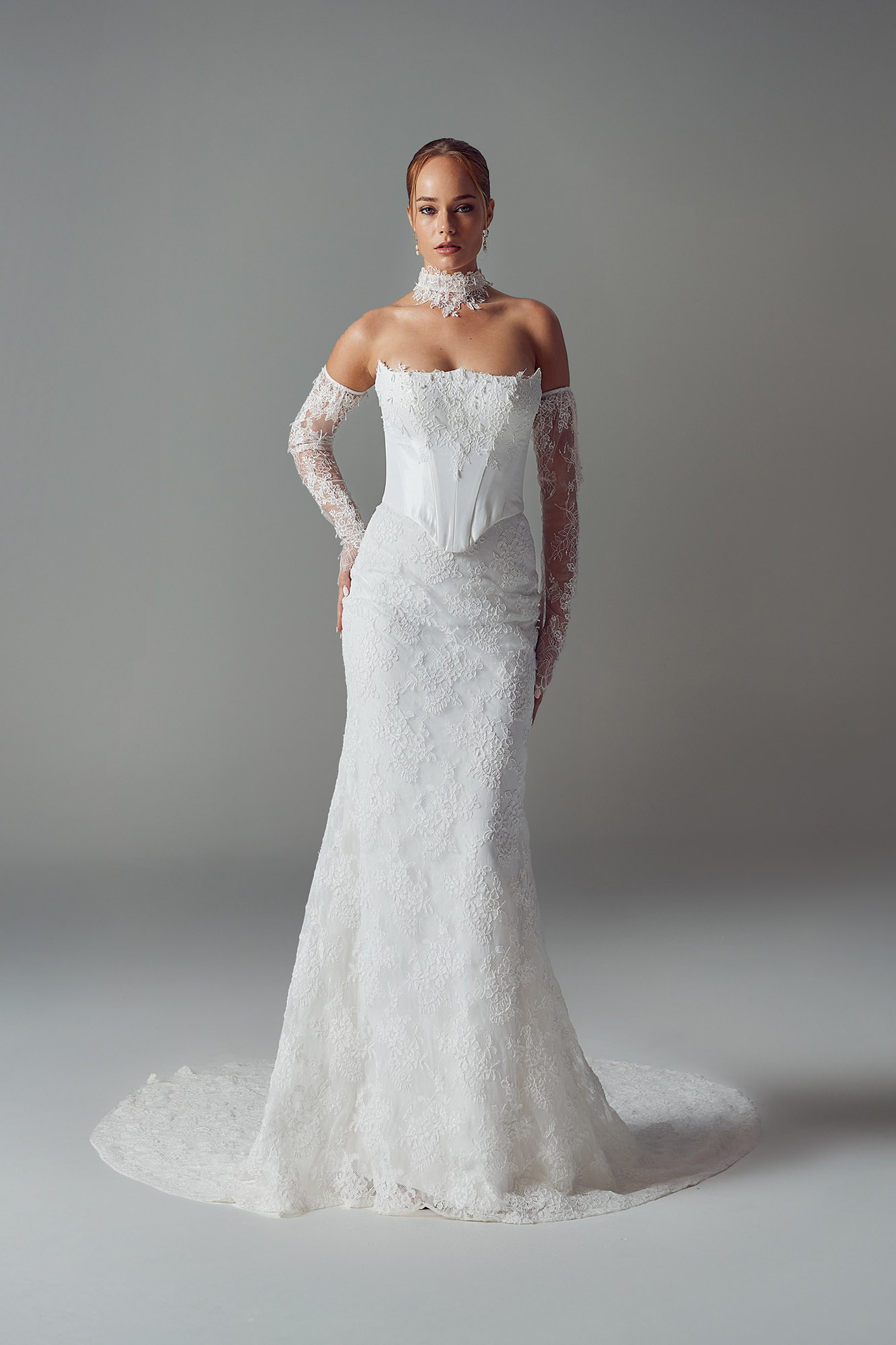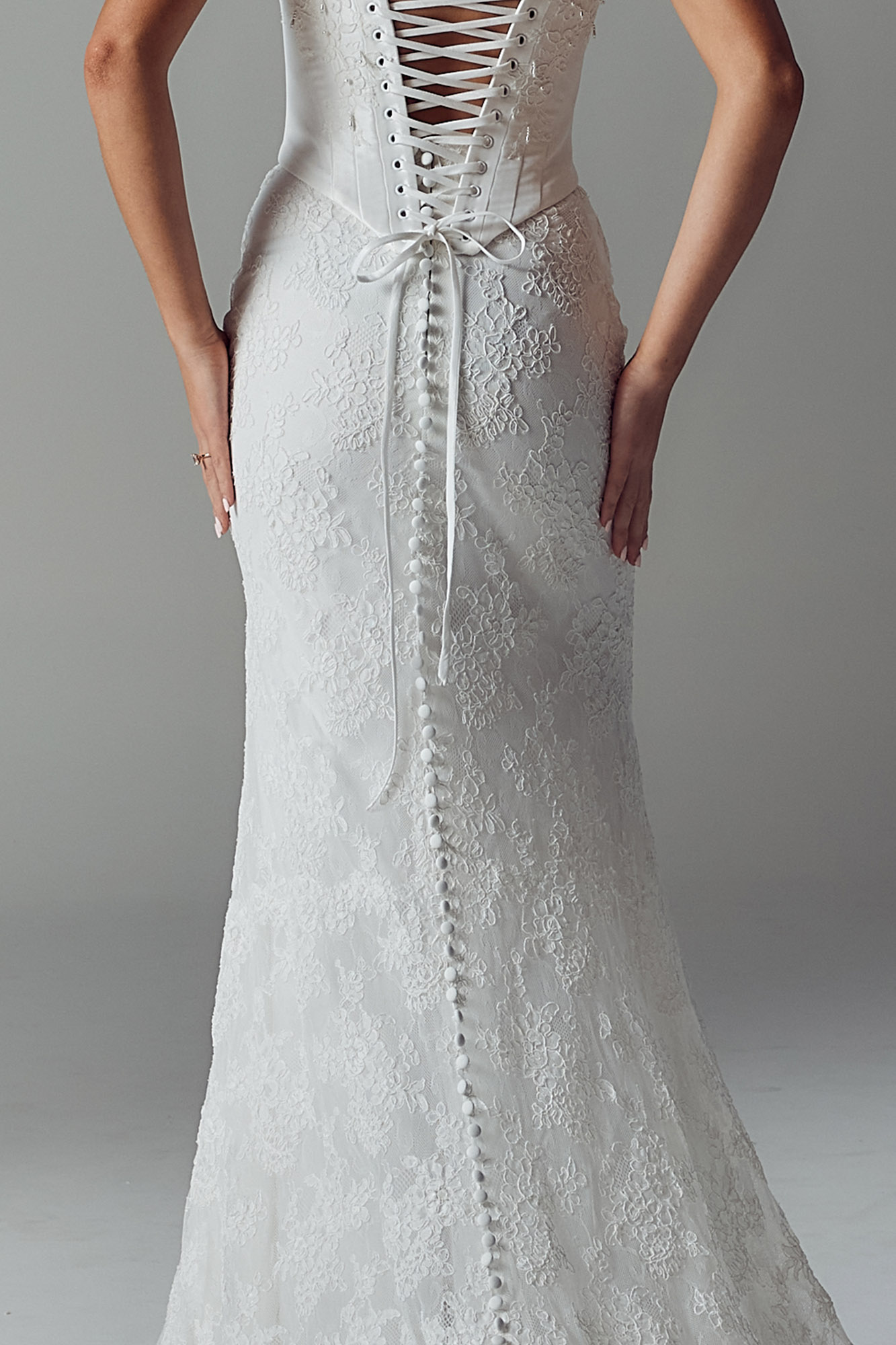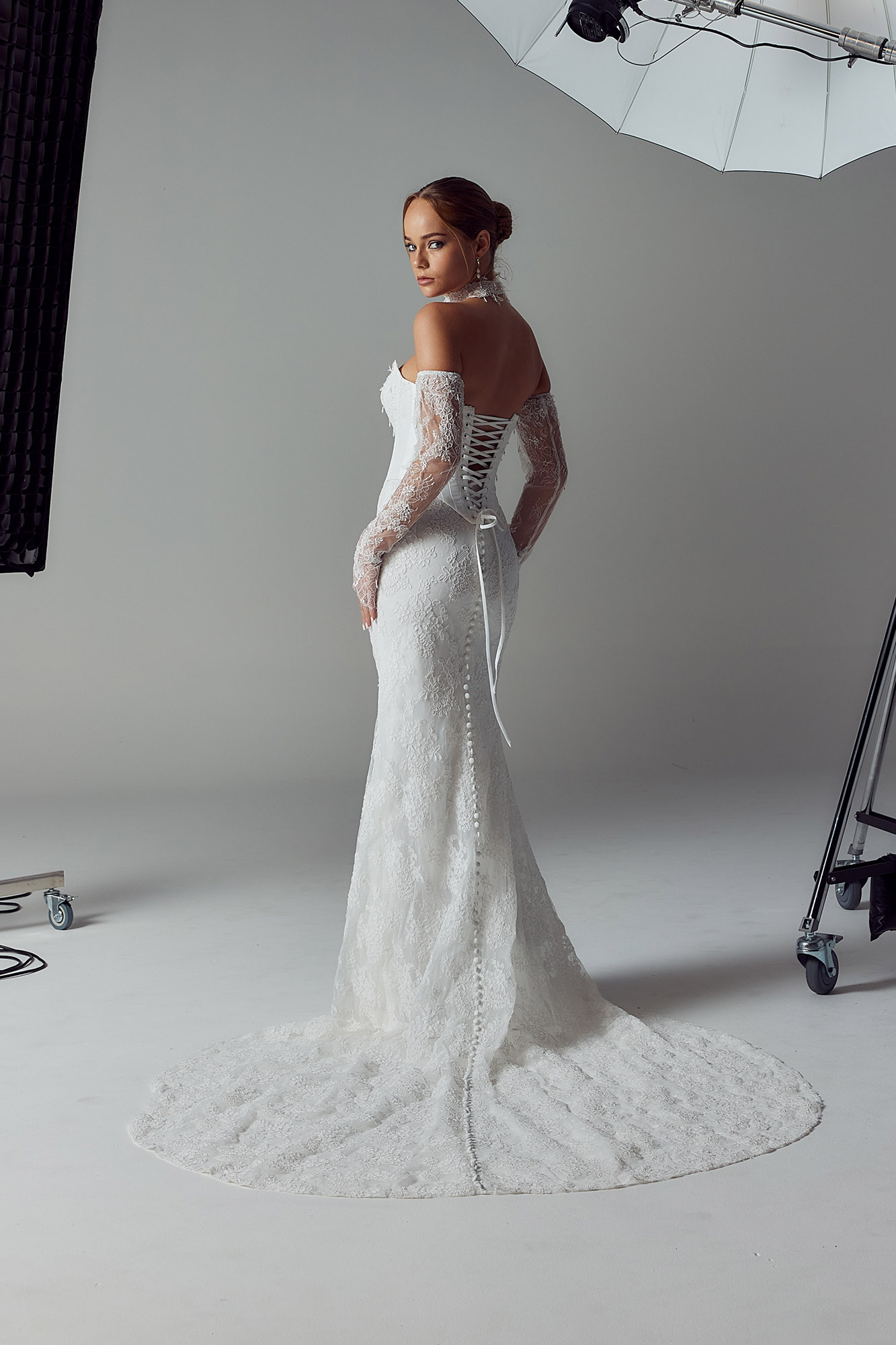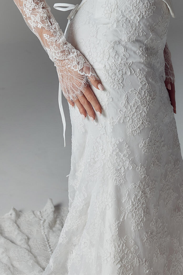 The Chantilly lace fabrication adding a sense of classicism and vintage charm to the design. All together creating a timeless, effortless bridal look.