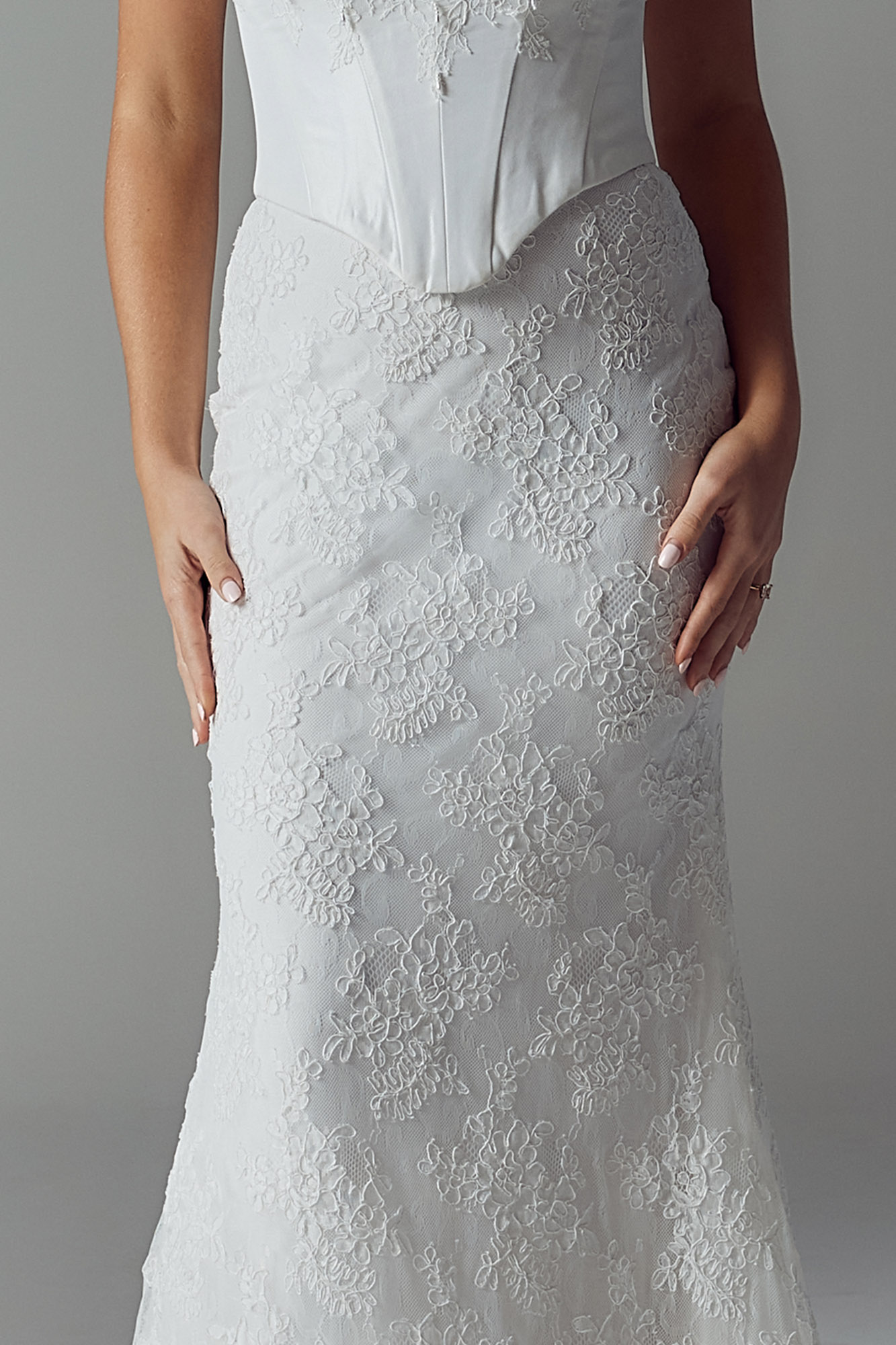 See all of our bridal separates for all the styling options to pair with this glamorous skirt. Shown here with our Georgia Bodice set with long sleeves