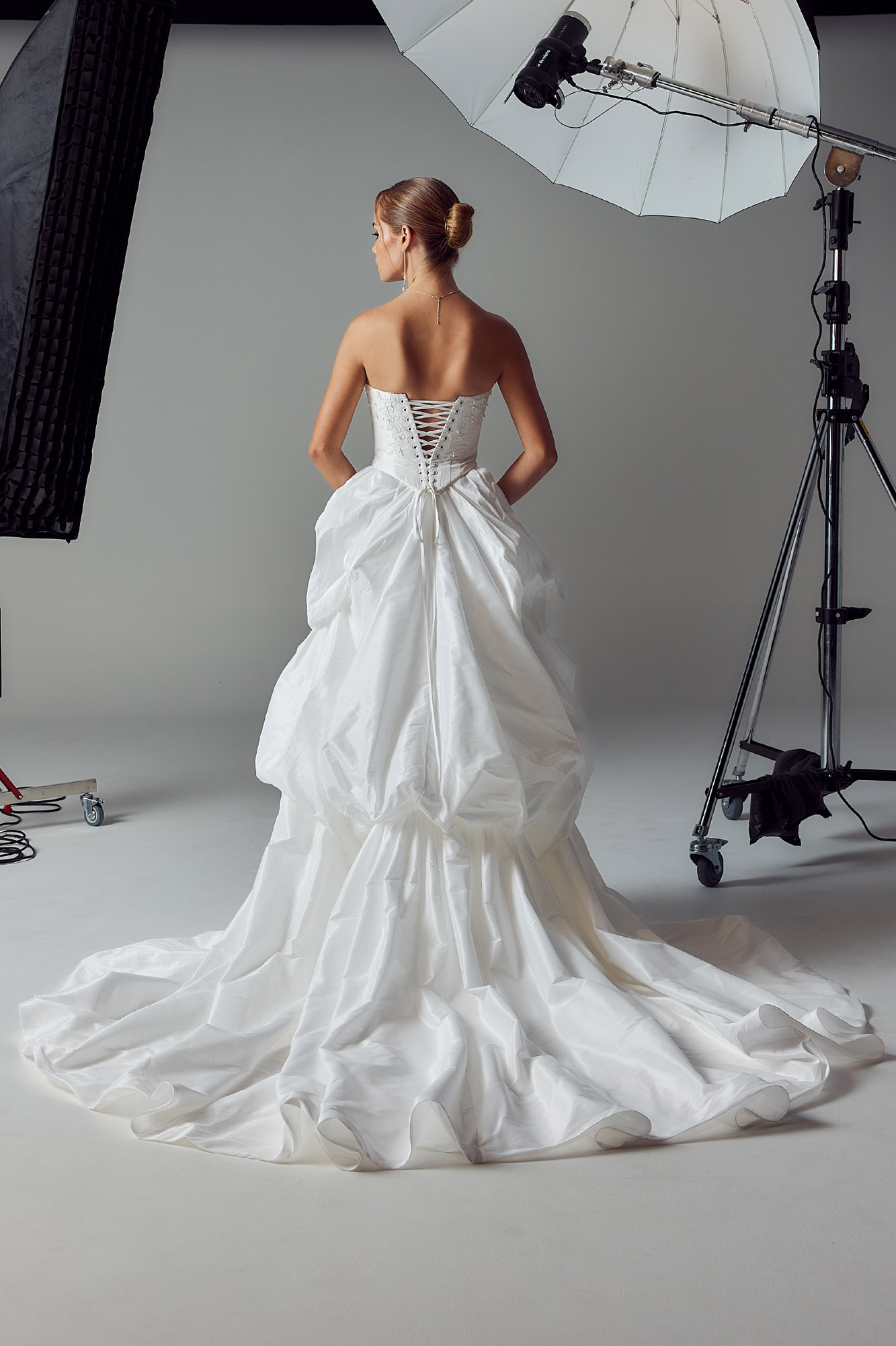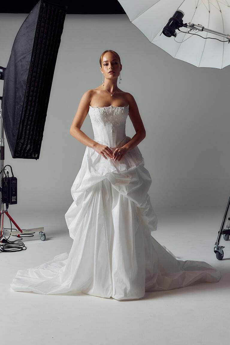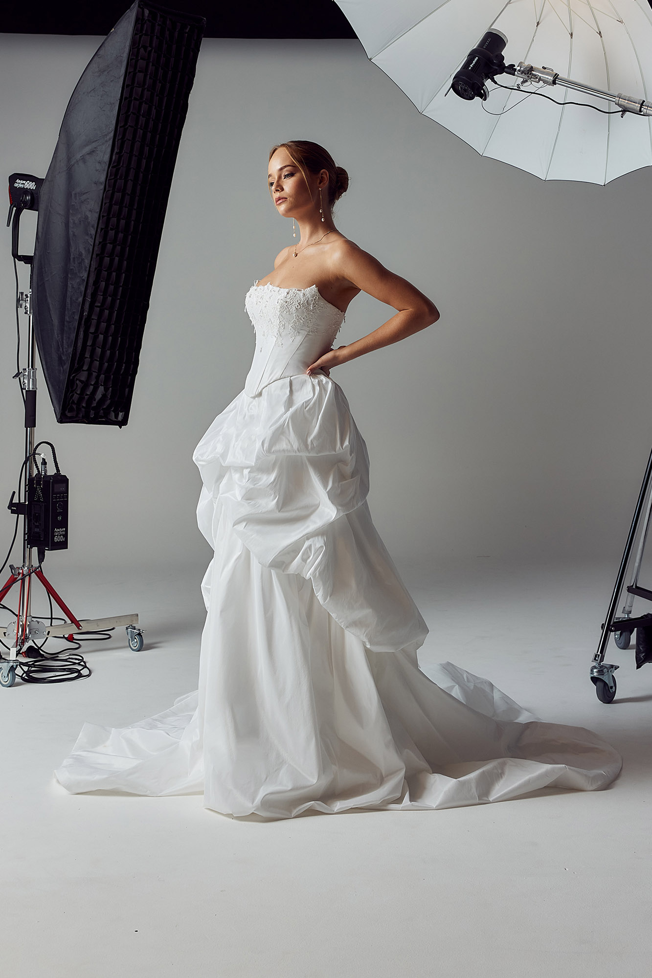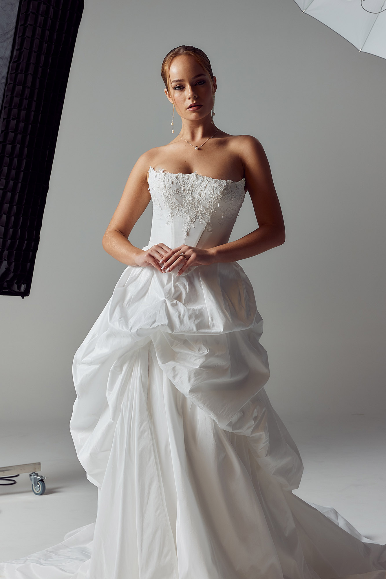 Designed in taffeta, with a natural waist and on-trend dramatic pick-ups throughout and a bubble hem for volume. All these elements working together to keep the design fresh with vintage-inspiration.