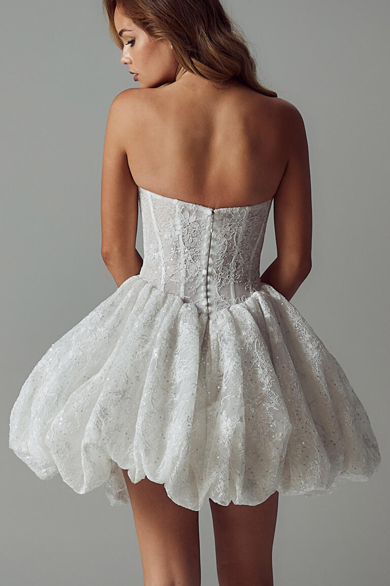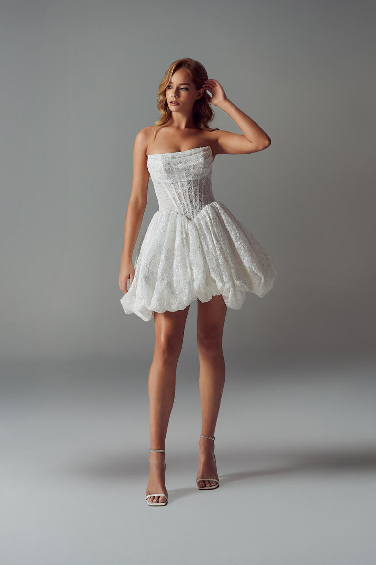 Whether for the unconventional bride or as a secondary wedding day look, our Rhonda Mini wedding dress steals the show.