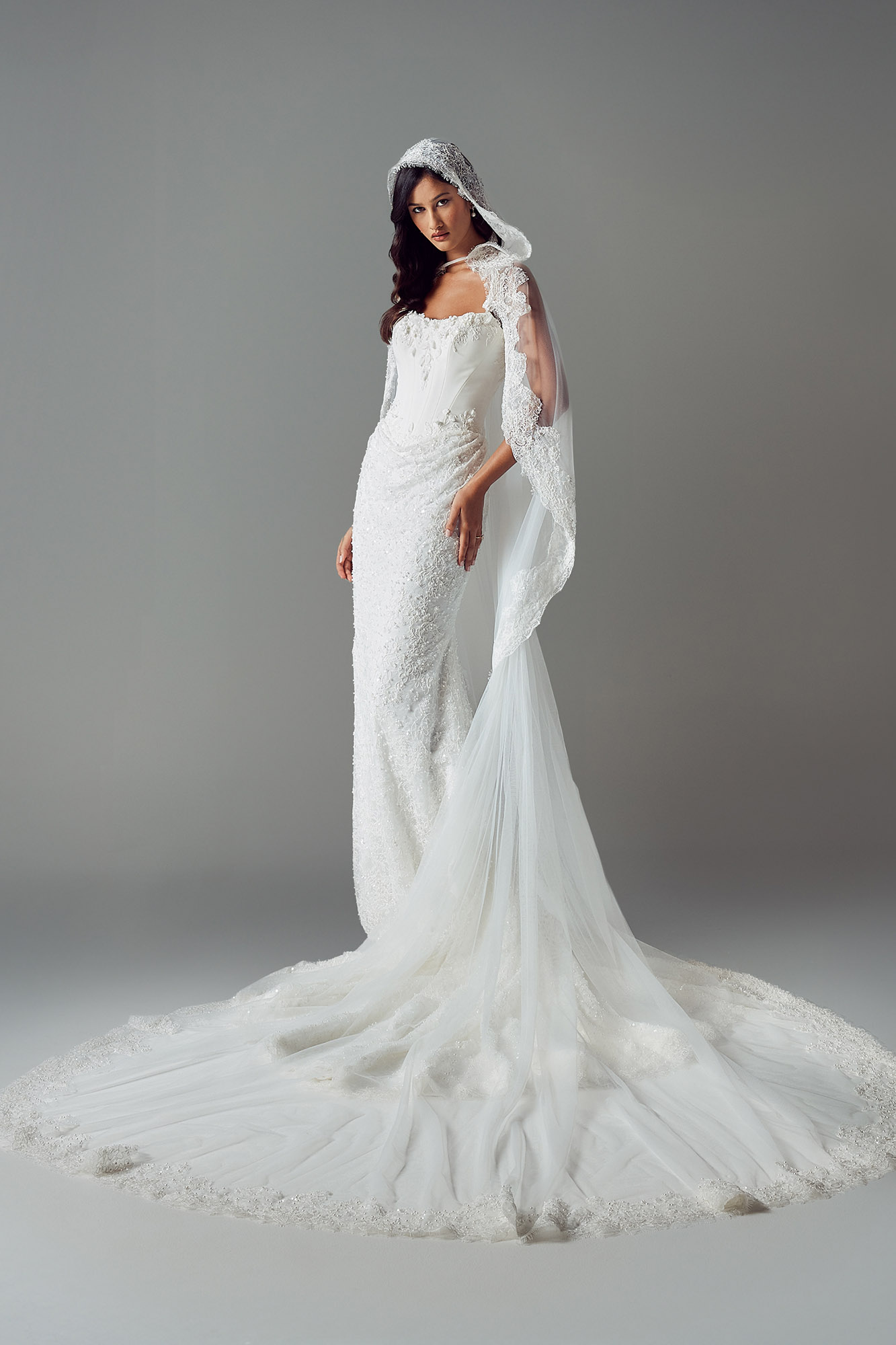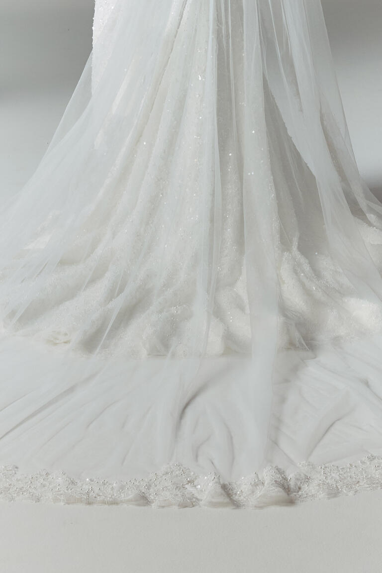 Designed in tulle and trimmed with Chantilly lace, this cape can add personality and drama to a variety of looks. However, designed to match perfectly to our Rikki wedding dress.