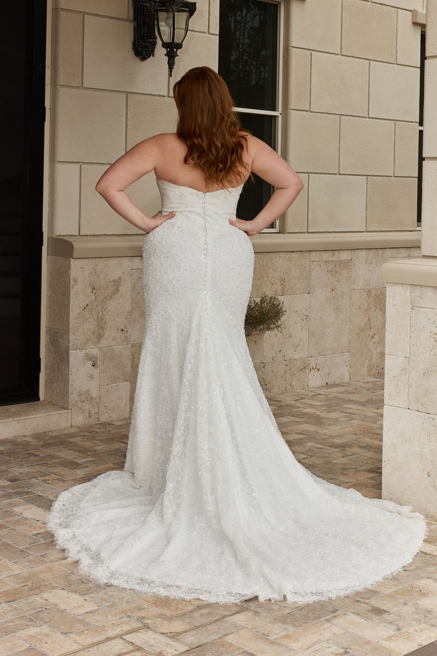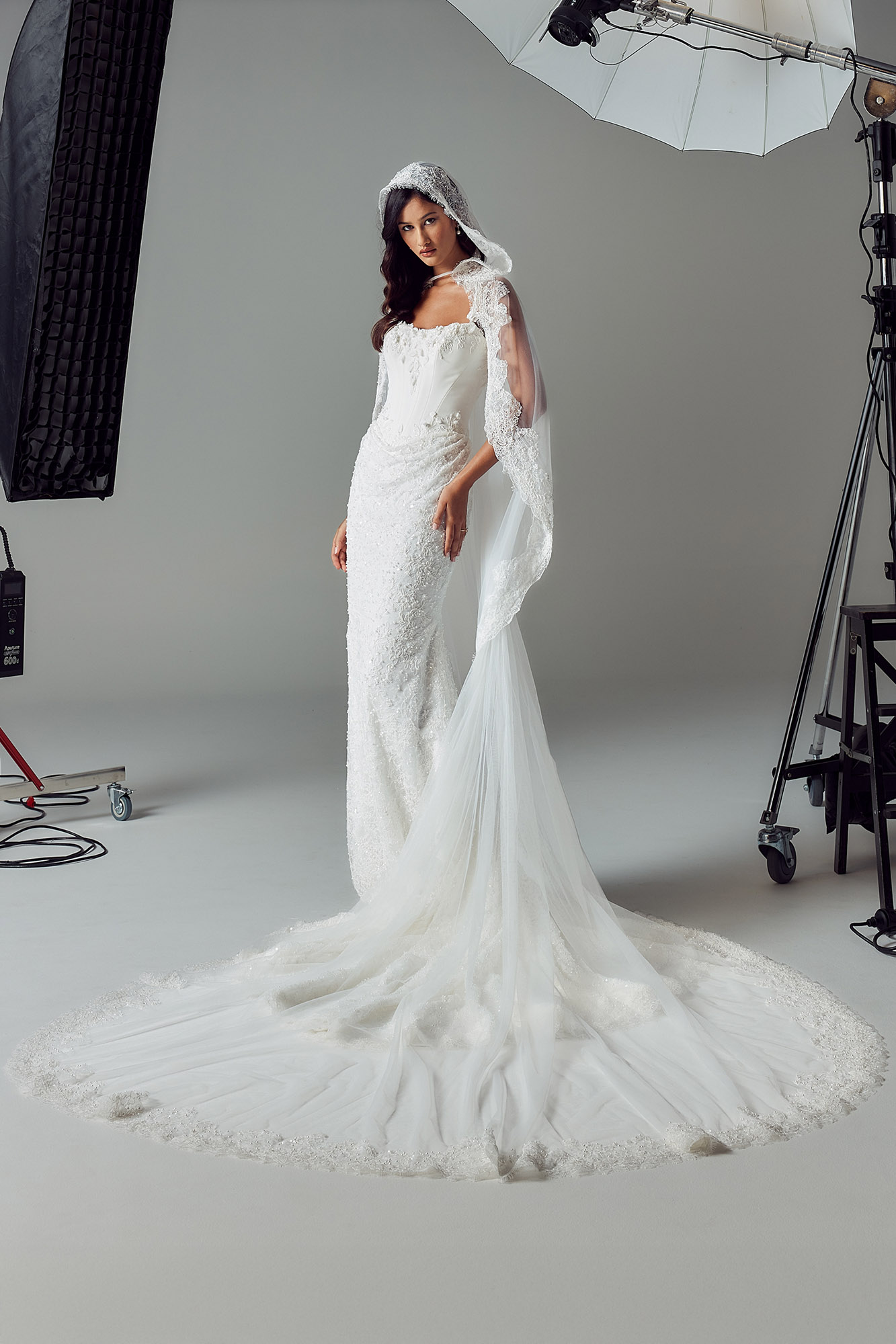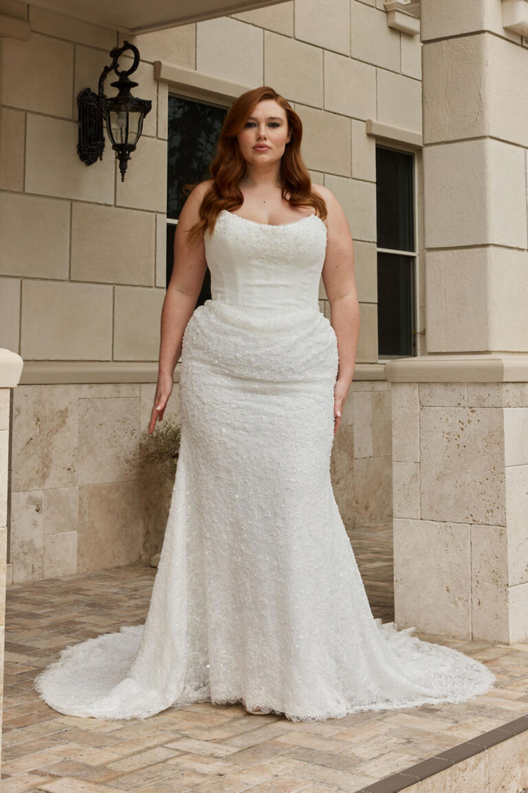 Softly flaring below the knee, the skirt transitions into the glamorous train. Finished with a scalloped eyelash lace trimmed hem.