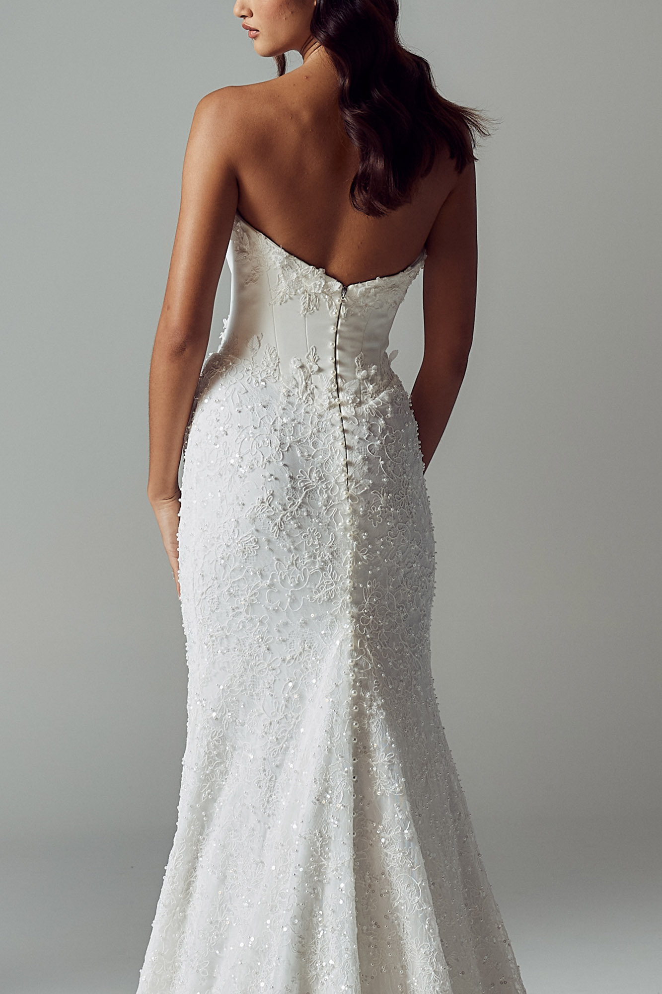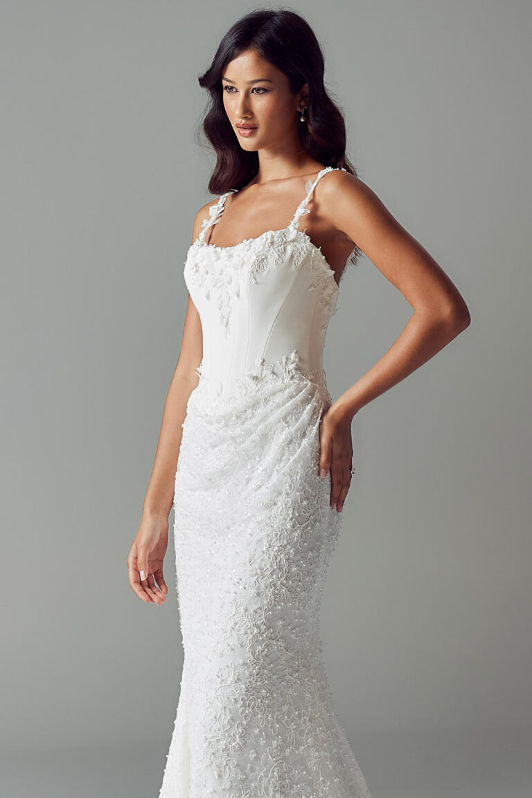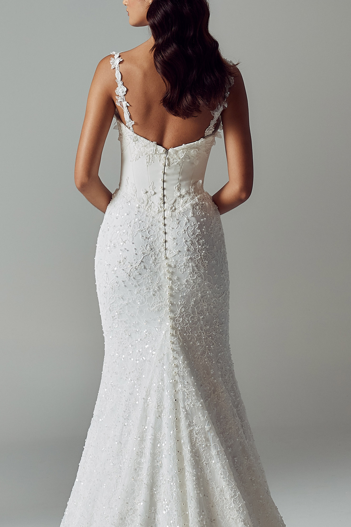 Below the waistline, the fit-and-flare skirt is draped across the hips to flatter and add romantic movement in the design. Encrusted by sequin beaded Chantilly that has an otherworldly glistening effect under the light.