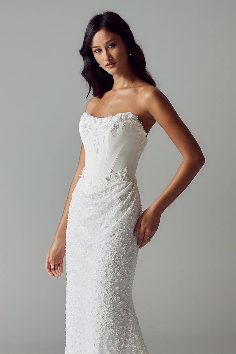 The scoop-neck bodice is supported by embroidered shoulder straps. Detachable, for a streamlined, strapless option.