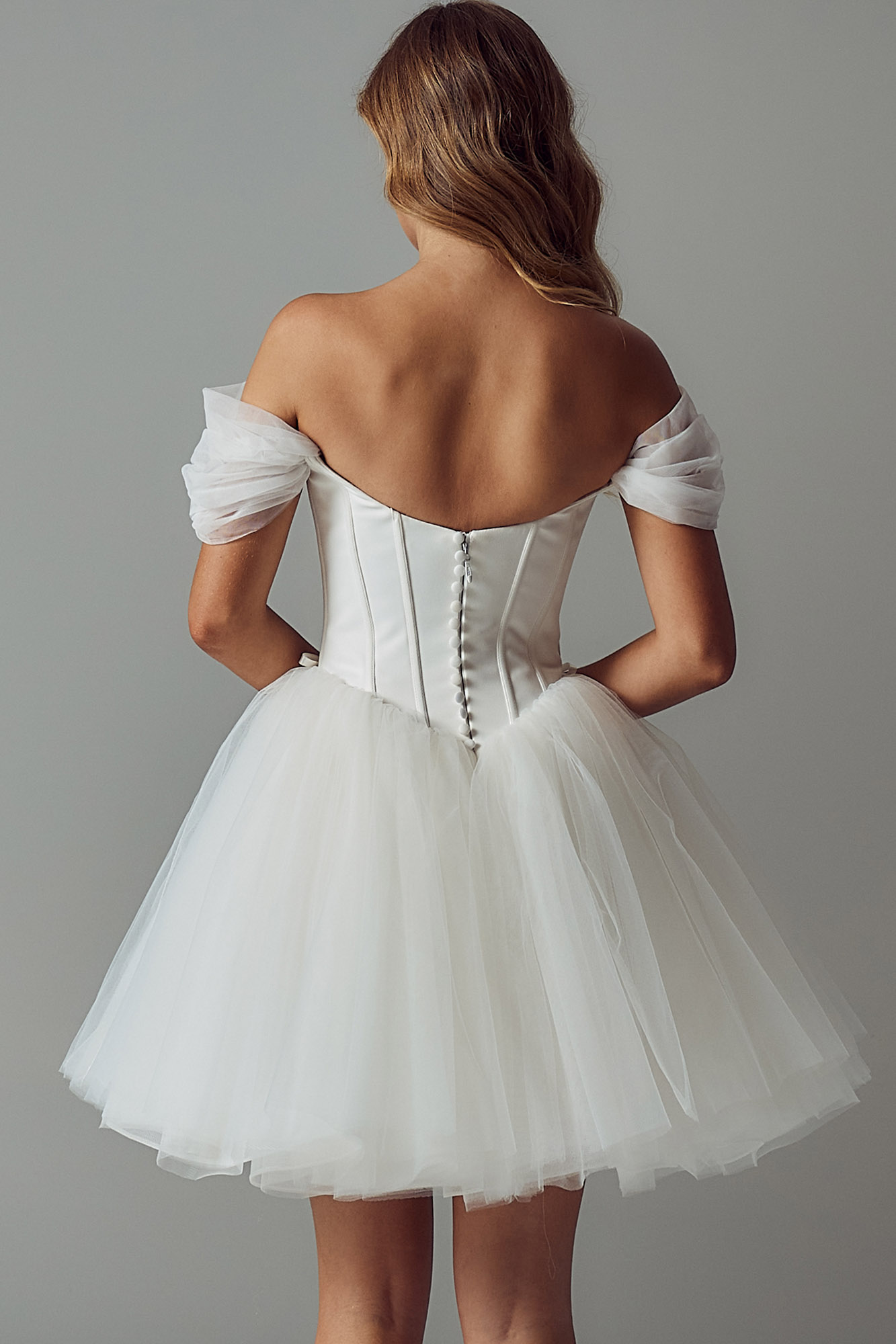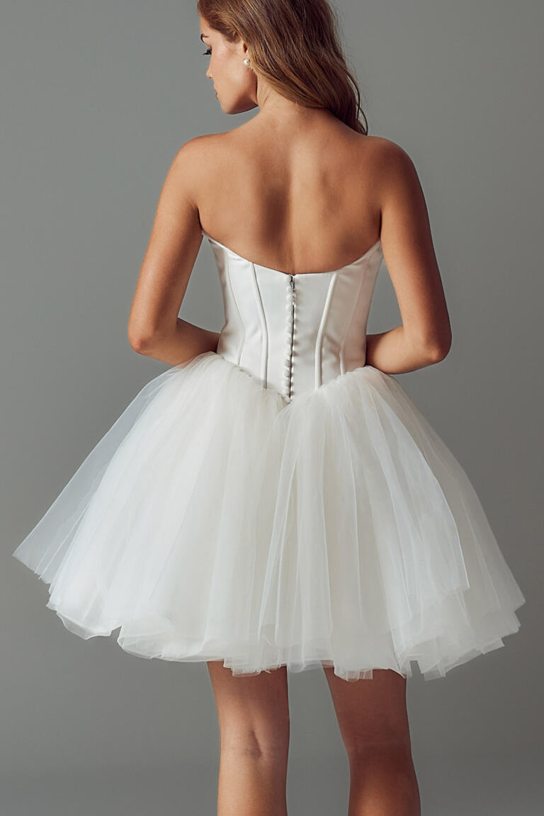 Cute bow details sit either side of the sharp Basque waist. Just above the full, mini A-line skirt crafted with layers of tulle. Keeping the look light and chic.