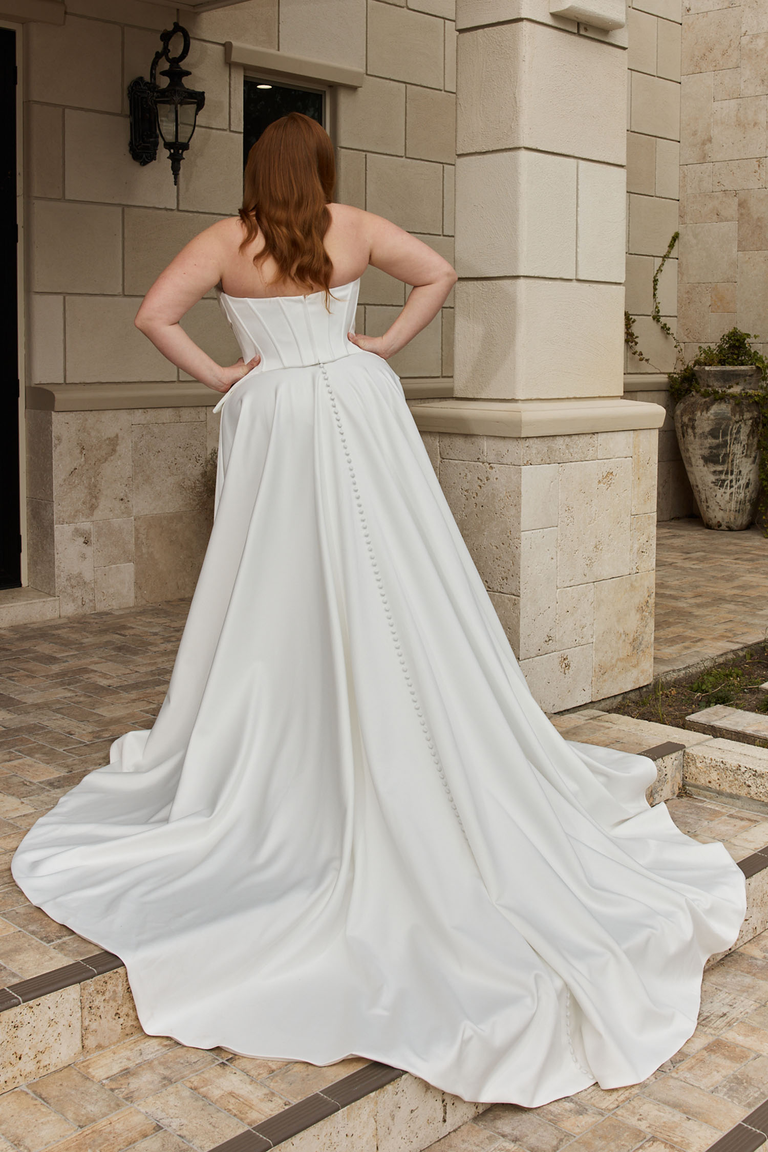 A vertical row of buttons along the back from waist to hem add a sophisticated, polished touch to the design.
