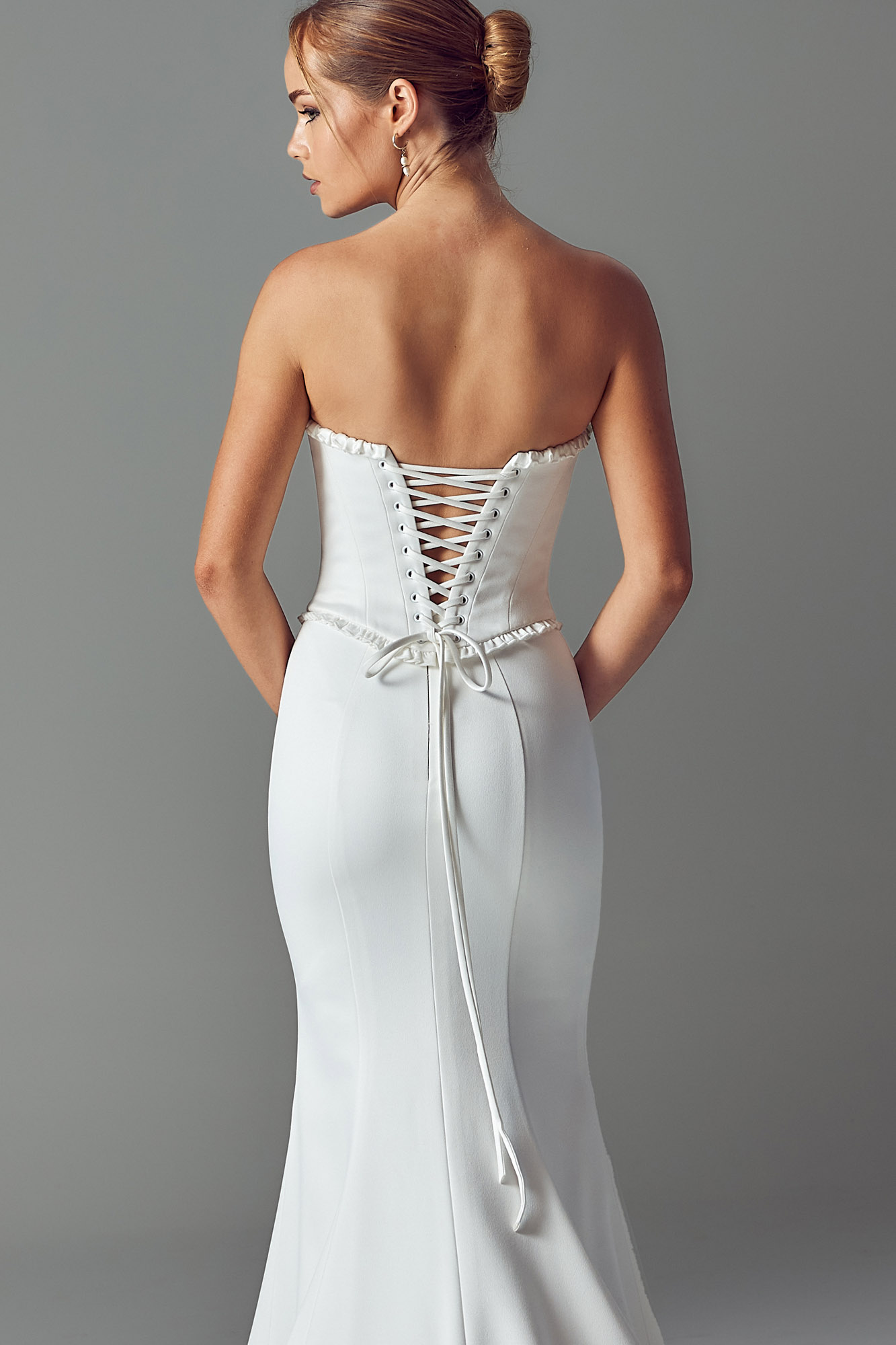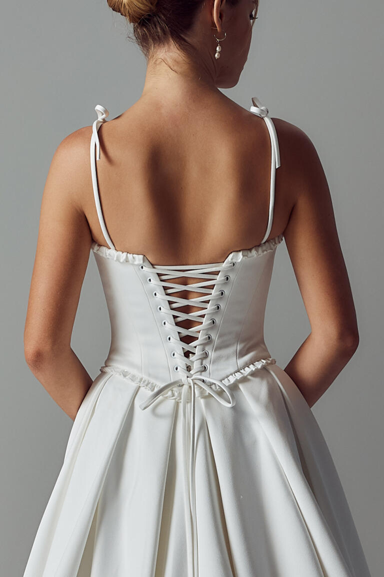 A modern straight neckline frames the bust, detailed with a ruffled satin trim that outlines the bodice across the chest. This trim continuing through the line of the Basque waist. Supported by delicate tie shoulder-straps that quietly elevate the design, with the option to be worn strapless.