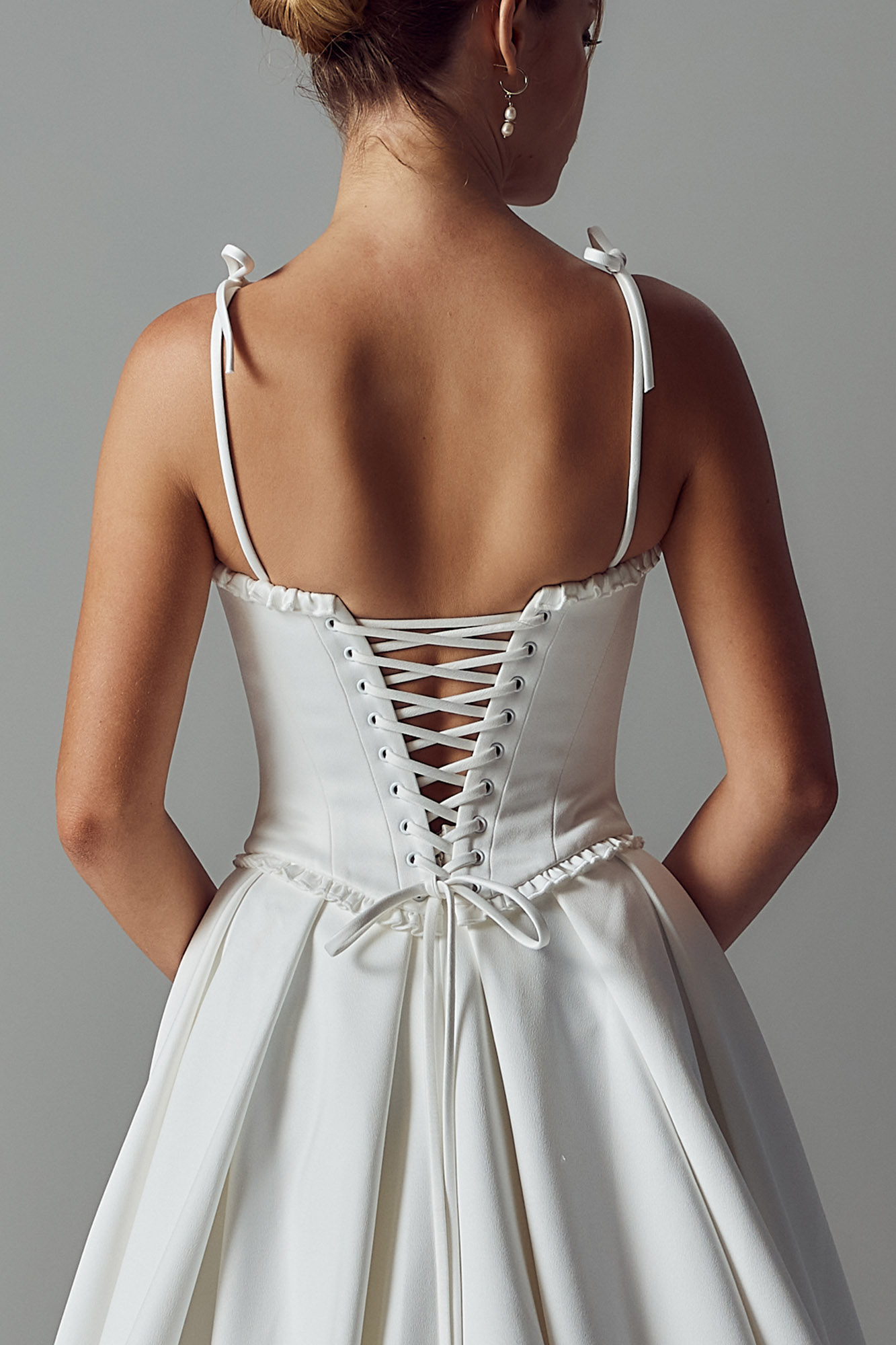 The bodice is completed by a romantic, corset-style lace-up back that feels slightly traditional. While also adding security and cinching the figure.