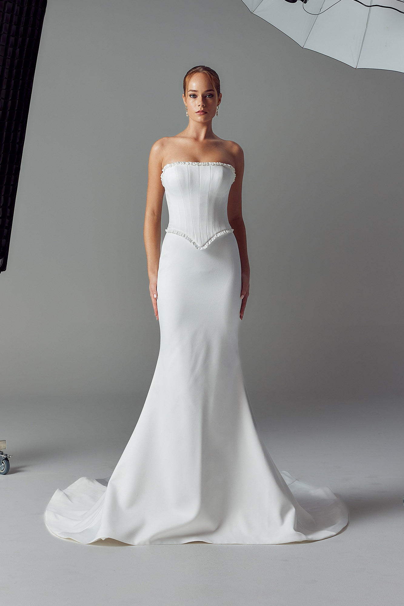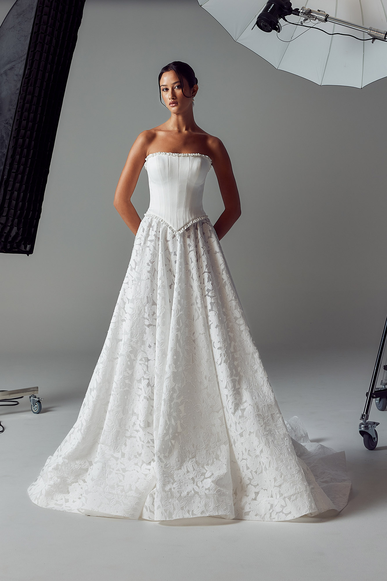 Exposed seamlines contour through the bodice and lengthen the torso. Creating a snatched look desired by modern, trend-focused brides.